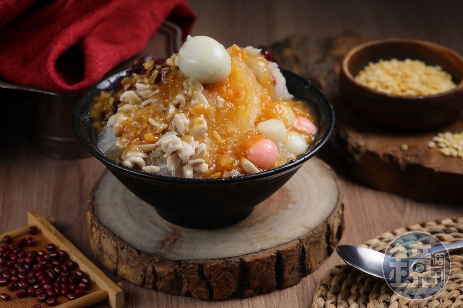 糖水可說是冰品的靈魂,由劉老闆特製的綠豆蒜糖水,以長糯米、綠豆仁與蔗糖一同熬煮,使香氣與甜度達到完美平衡,讓這碗冷熱冰都吃得出芋頭的綿密、花生的鬆軟及紅豆的細膩香甜,隨著溫度降低,剉冰上點綴的大小湯圓,逐漸展現出彈牙韌性,成為冰品中畫龍點睛的一筆。