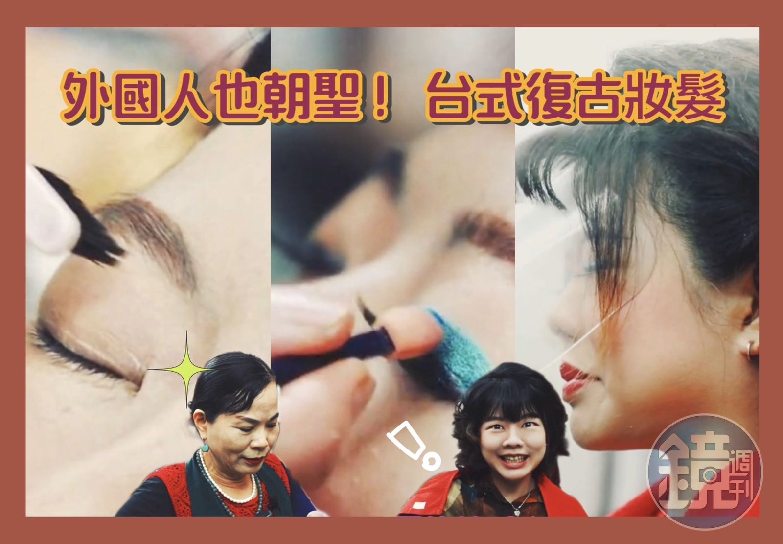 如果髮型的前置算得上飛快,化妝的步驟簡直是光速。李月蕊提到,以前的人化妝就是講究粉底要白,厚度也要夠,才能堆疊出所謂的「蘋果肌」;而上妝的力道,她也自己笑說:「以前都很粗魯,手勁比較用力。」