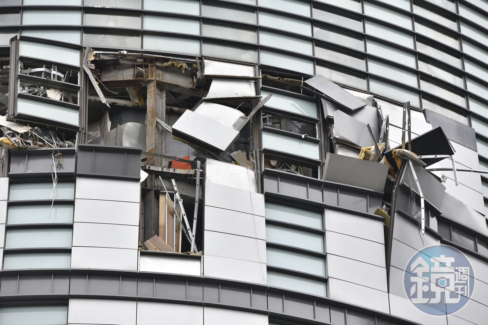 台中新光三越事故現場滿目瘡痍,由於氣爆威力驚人,百貨外牆被炸穿,不僅冷機外機懸吊半空中,1、2樓玻璃大門也因氣爆震碎,更傳出有4名民眾被炸飛。至於百貨內部,除電梯毀損變形,水管破裂噴水,天花板、磁磚碎裂一地。