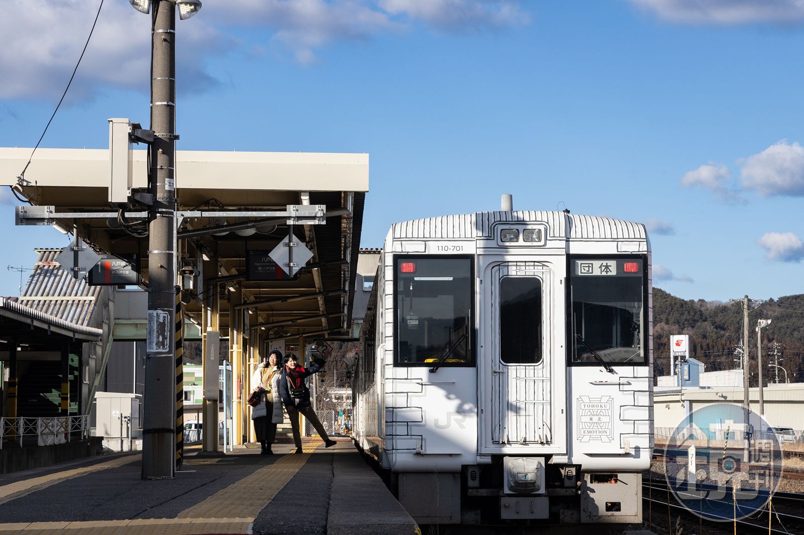 我們這次搭乘的是從久慈前往八戶的回程路線,下午2點18分從久慈站出發,沿途停靠種差海岸站、鮫站、本八戶站。當列車緩緩行駛在鐵軌上,窗外從東北特有的田園風光,漸漸變換成令人心曠神怡的遼闊海景,讓人想起了宮崎駿動畫《神隱少女》裡,那輛行駛在海面上的列車。