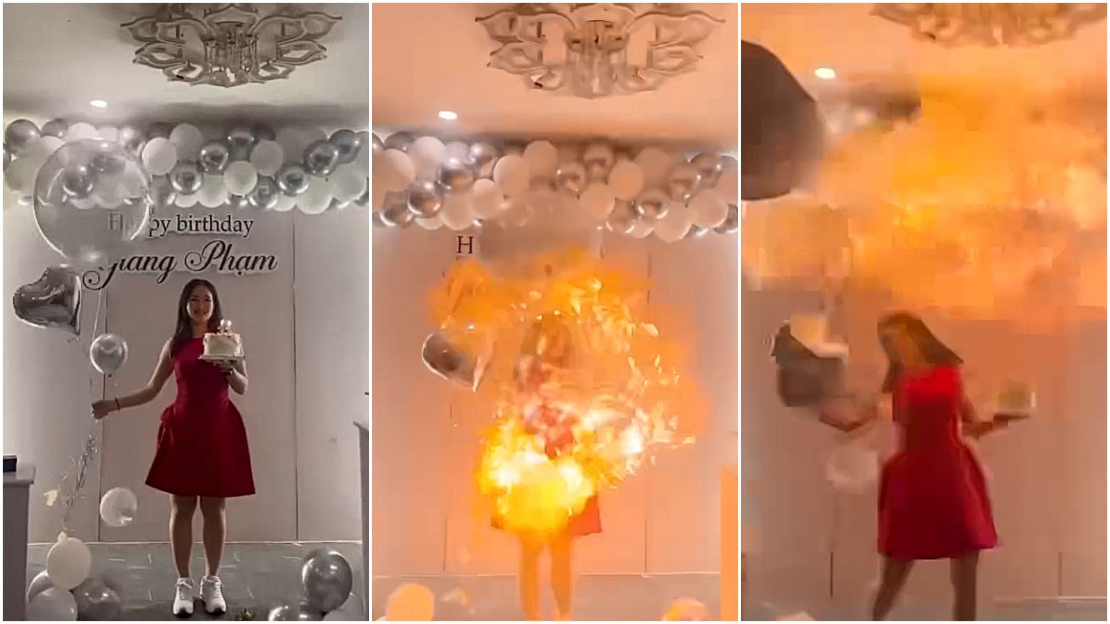 慶生典禮上,越南女子Giang Phạm身穿紅色小洋裝,一手捧著插蠟燭的蛋糕,另一手握多顆氣球隨著歌曲搖擺。接下來發生恐怖一幕,當氣球碰觸蠟燭的火焰時,瞬間爆炸起火,她根本閃避不及,臉部被燒到冒煙。 這場突發意外導致她右半邊的臉部嚴重燒燙傷,嘴唇及脖子也難逃火燒,另一張照片可見她臉部及手包滿紗布,面露痛苦神色。 Giang Phạm在事發過後近一週選擇於臉書分享這段可怕經歷,提醒大家注意別重蹈覆轍;至於傷勢上,她表示目前已逐漸康復中,並已繼續進行賣鞋工作。