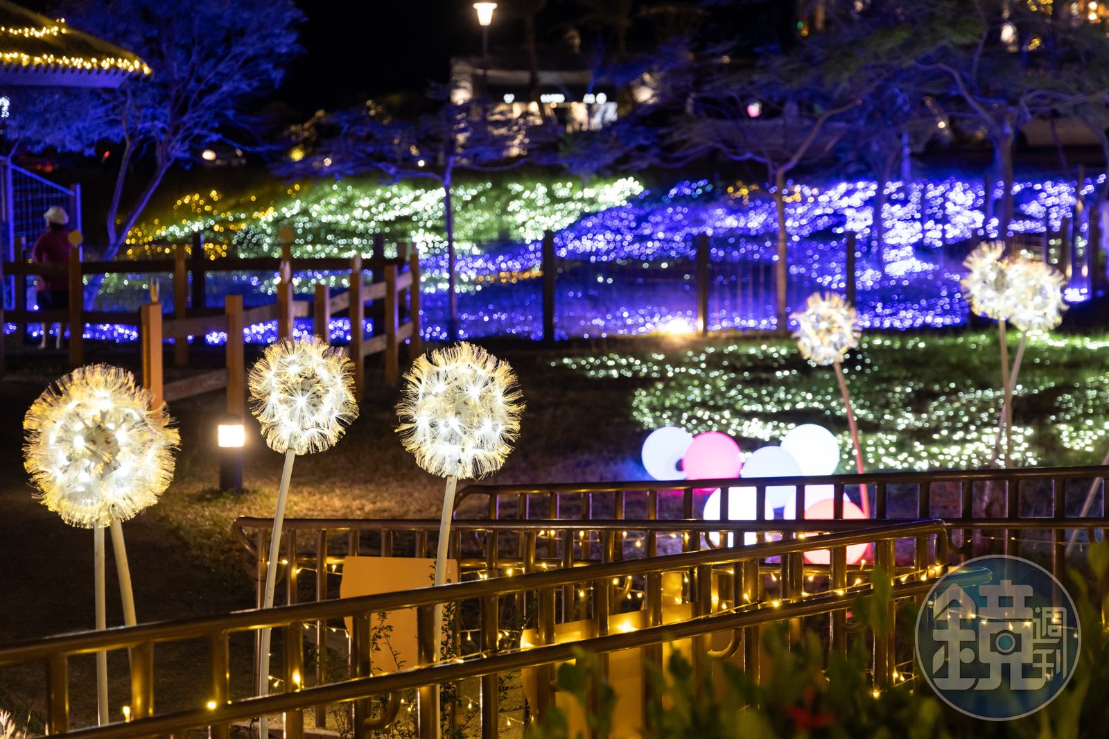 設計師將光藝術自然融於四重溪原有的天然環境,像是樹梢上的鳥巢、腳邊的蘆葦草,到了夜晚都會發光,讓遊客驚喜連連。入夜後,千盞燈海點亮園區每個角落,免費的公共泡腳池就是最舒適的景觀第一排。