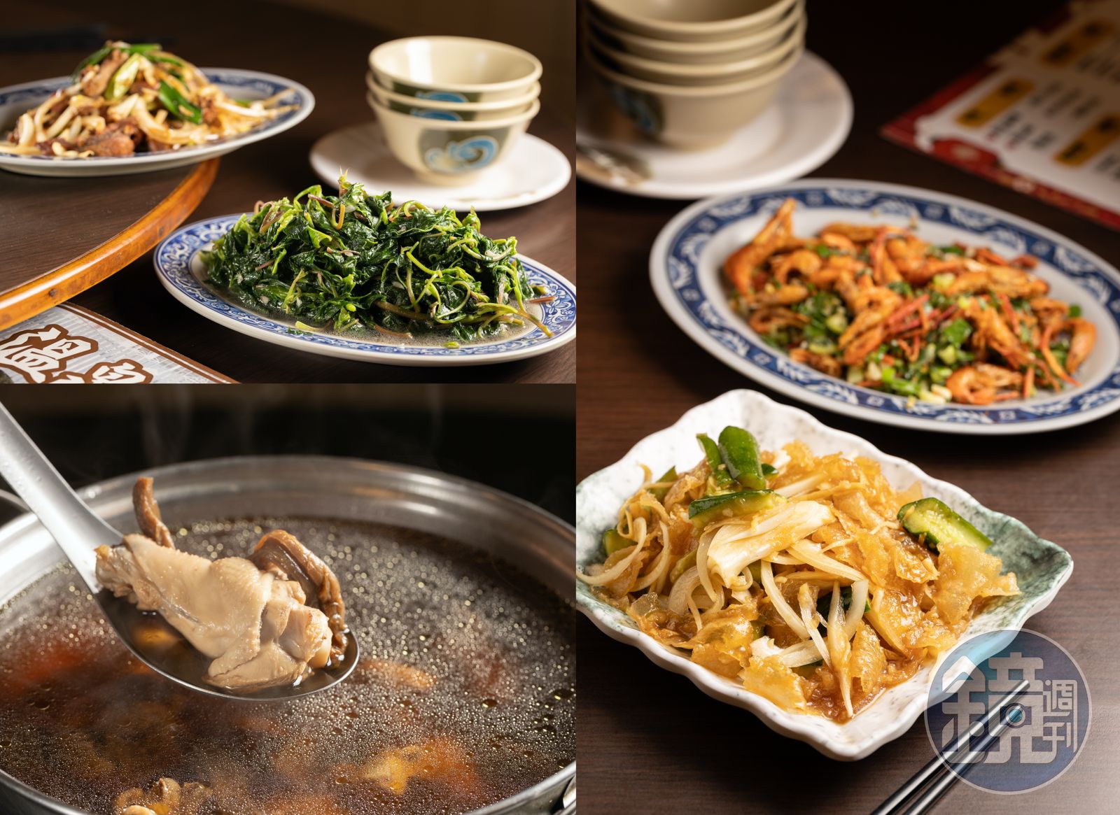 口感近似於海蜇皮的「涼拌山豬皮」(前,220元/份)酸爽開胃;標榜正野生的「鹹酥溪蝦」(後,300元/份)每隻蝦都很有肉。並非每天都吃得到的手摘野菜「山莧菜」(前,120元/份),雨季時會特別嫩;「蔥爆鴕鳥肉」(後,250元/份)使用屏東在地養殖的鴕鳥肉。「黑胡椒山豬肉」(前,250元/份)非常下飯,想換換口味可來一份九層塔與小黃瓜拌炒的清爽版「青醬透抽」(後,360元/份)。老饕必點的招牌「菜脯雞湯」,雞肉使用在地放山雞,搭配自家醃製至少五年的小蘿蔔「牛杙仔」,二姐自信介紹著屏東的驕傲物產:「白玉蘿蔔做成的菜脯味道更香,煮湯不會有中藥味,關鍵要加入年份更久的老菜脯提味,湯頭會更鮮甜。」小蘿蔔為了抵抗落山風惡劣的生長環境,將養分都送到地下莖,因此醃製出來的菜脯特別香,煮出來的湯當然也很甘甜,適合冷天多喝幾碗。