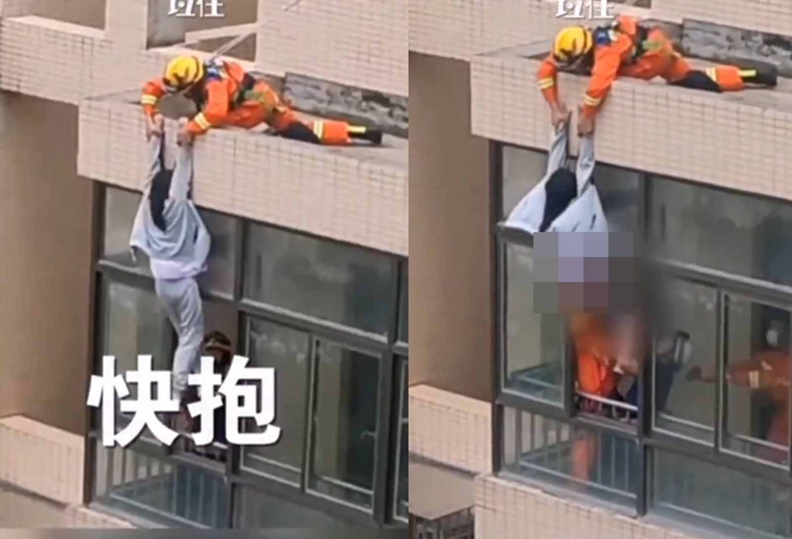 面對女子雙腳懸空、生命危在旦夕的緊急情況,另一名消防員機景從樓下房間窗邊,試圖把女子拉回屋內。然而,意想不到的是,在救援過程中,消防員不小心將扯下她的運動褲,儘管面臨如此尷尬的局面,消防員仍沒有退縮,毫不猶豫伸手撐著她的臀部,最終成功將她拉回屋內。