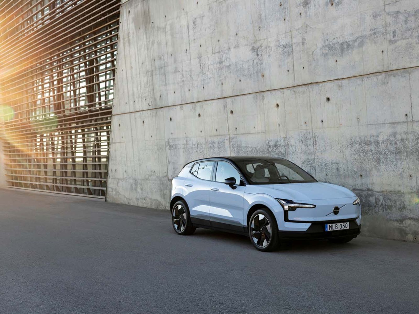 車側線條採用黃金比例帶來更為立體且緊湊的視覺感受,同時運用雙色車頂、外擴式輪拱與19吋黑色鑽石切割附空力嵌飾鋁圈,更創造出掀背跑格的性能氣息;車尾設計則展現 北歐美學的簡約典雅本質,辨識性極佳的創新雙層 LED 尾燈同樣具備動態迎賓模式,亮黑大型車頂尾翼與厚實寬闊的後保桿打造小休旅中的大氣勢,搭配面積達 1.2 平方米全景式玻璃車頂,為EX30喊出的「小 即大作」口號寫下最佳註解。