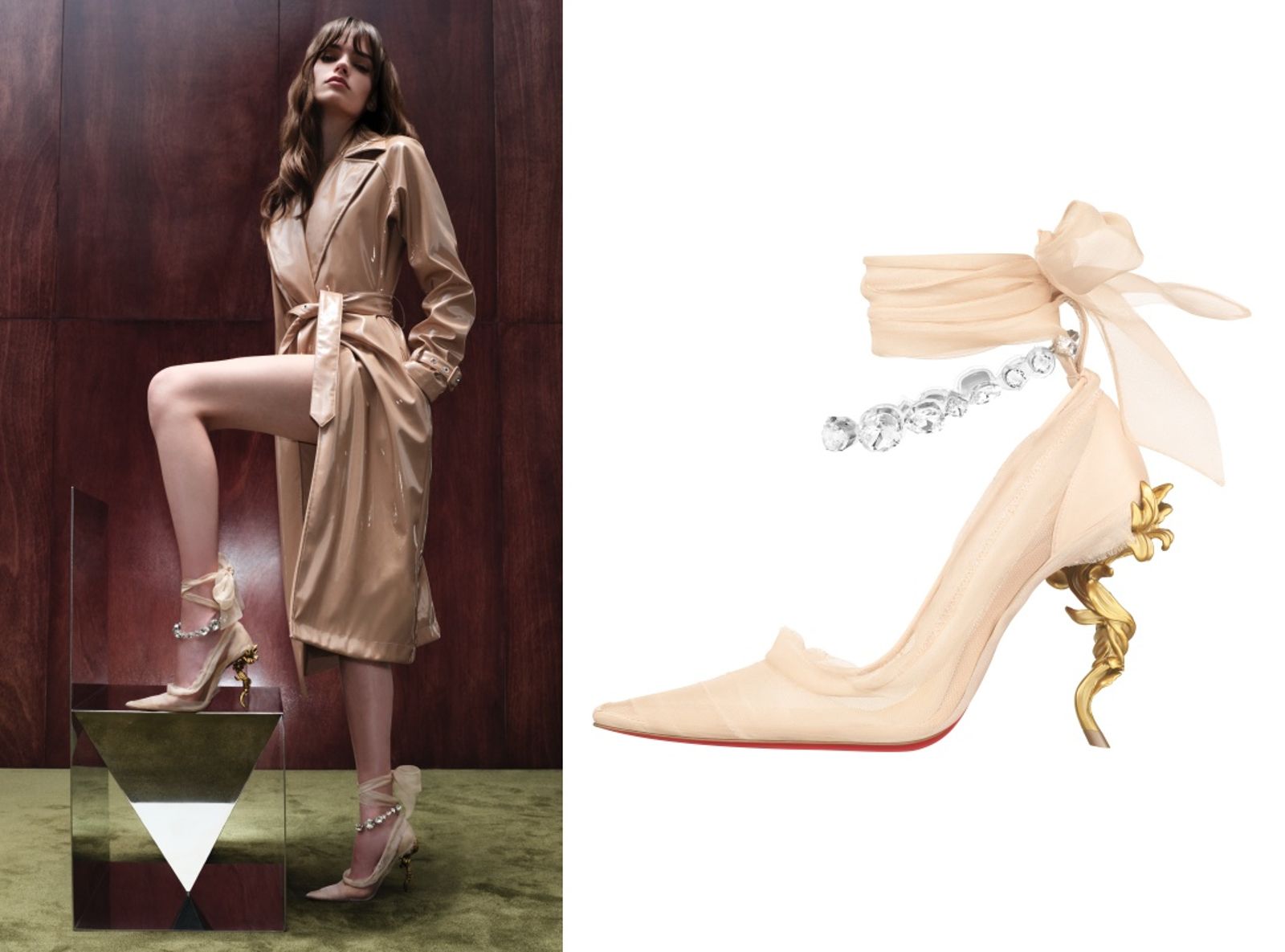 深受《美女與野獸》電影啟發, Christian Louboutin先生將電影細節巧妙融合品牌精湛製鞋工藝,再現童話的浪漫細節,並以獨特視角重新定義美麗。以透明烏干紗打造的「BELLE AND JEWELS」展現若隱若現的美感,璀璨珠寶腳鍊閃耀於腳踝處,宛如童話中的魔法點綴,搭配不規則狀的精緻鞋跟,為步履間增添浪漫光彩。