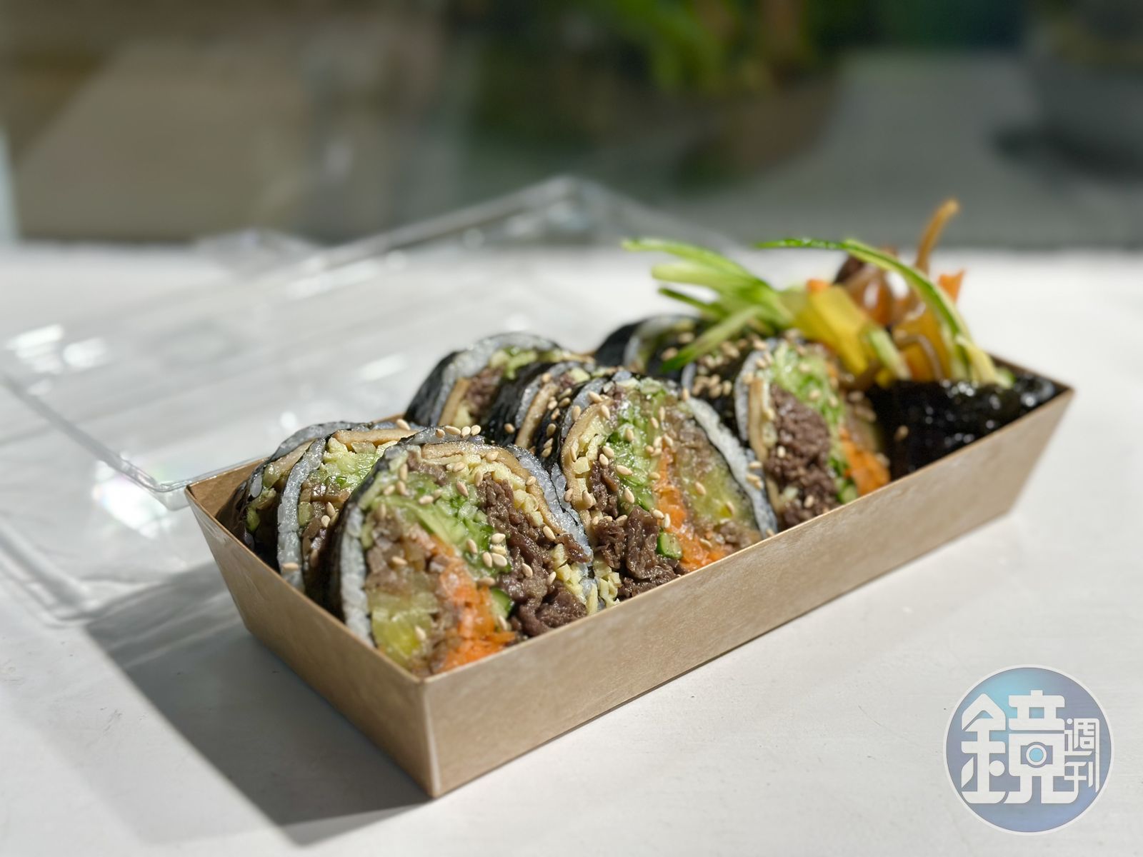 「圃樂韓式小吃坊」在捷運劍潭站旁開業3年多,主打飯捲和韓式小菜,僅供外帶。老闆娘(圖右)來自韓國南部,與丈夫(圖左)一起創業開店。有別於我以往吃到的飯捲,這間放的飯量偏少,而且會再擺一片海苔隔開配料。我點了「牛肉飯捲」,裡頭除了大量的肉片,還有大小切得一致的小黃瓜、紅蘿蔔、醃黃蘿蔔、蛋皮、韓國魚板,用料很豐富。