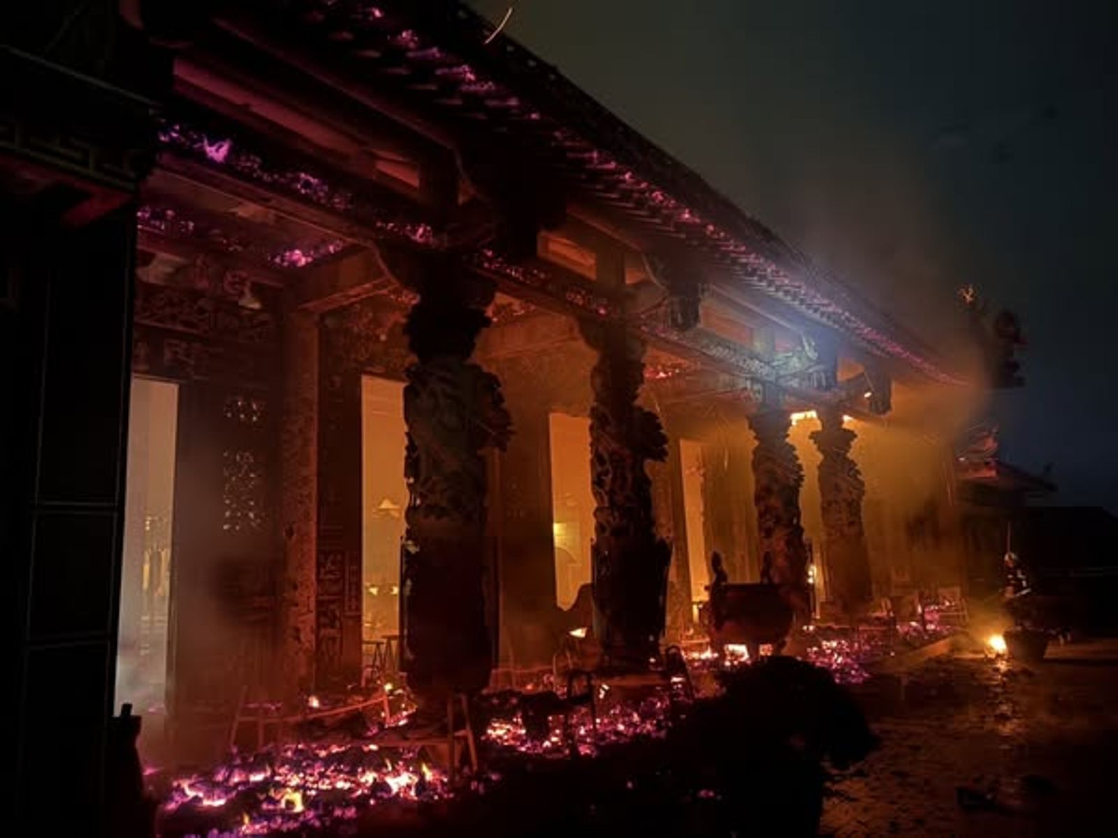 碧山巖凌晨3時許發生火警意外,燒燬雜物供品及木製樑柱雕刻。(翻攝自臺北市政府消防局臉書)北市消防局表示,今天凌晨3時22分消防局獲報碧山巖有火警,消防人員抵達現場時,火勢已全面燃燒,現場為寺廟用途,於1樓前殿起火,燒燬雜物供品及木製樑柱雕刻。