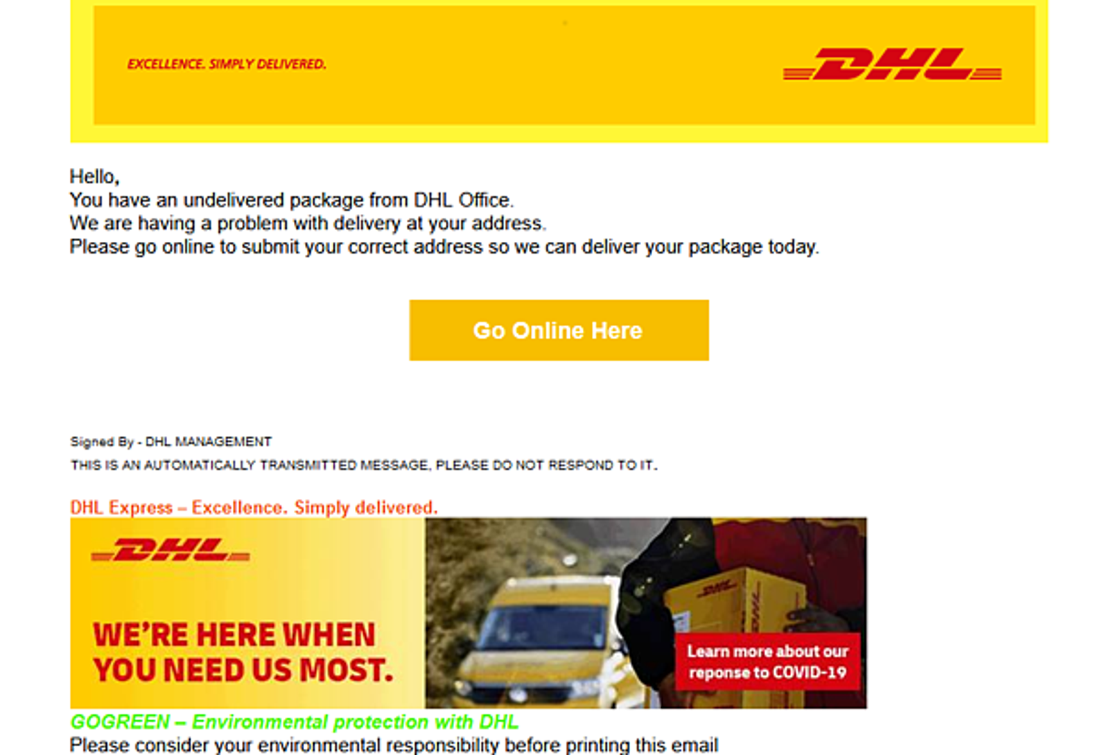 日前刑事局接獲情資,1位民眾因與美國教授有學術往來,欲收取自對方寄出的海外快遞,對方寄出後該民眾便收到號稱海外快遞公司DHL寄來的email,信中稱點擊連結補繳7美元的稅,否則包裹將遭到退回。