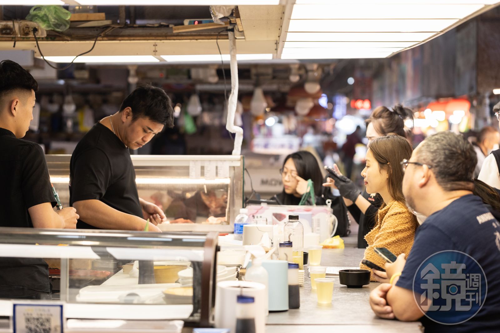 在東港華僑市場,沒有高大上的Omekase,新鮮的魚貨即是珍品。「漁郎生魚片」老闆曾信宏是位冷面笑匠,他誠實說:「做生意怎可能不考慮成本,品質好又要便宜的貨很難找,這時候就得靠交情了。」話不多的曾信宏總是在攤位上埋頭處理食材,一貫貫的鮭魚、黑鮪魚、海膽、花枝依序躍上盤中,熟客限定的隱藏版「漁郎特製套餐」豪華上桌,華麗程度連路人都忍不住上前詢問,一盤就呈現了整片大海的鮮美。