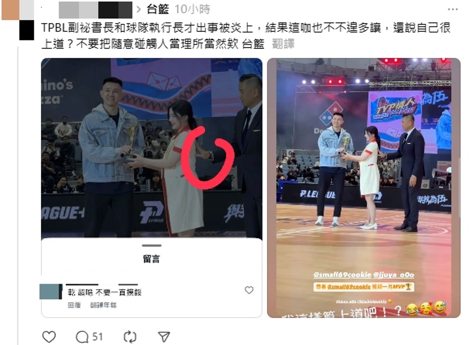 一名網友在Threads貼出當時畫面截圖與影片表示,「TPBL副祕書長和球隊執行長才出事被炎上,結果這咖(陳建州)也不遑多讓,還說自己很上道?不要把隨意碰觸人當理所當然欸」,並附上爭議片段讓網友自行判斷。