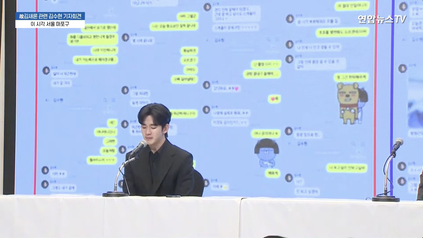 金秀賢在記者會上透露「金賽綸未成年時,我們並未交往。關於她因為我所屬公司債務壓力而做出的悲劇選擇的說法,也是假的。」他解釋,作為證據的照片和影片經過巧妙修改,並指出這些聊天記錄並非原版,顯示出有人在散播虛假的證據和證詞。遺屬公開金賽綸的2016年和2018年的聊天記錄,聊天對象並不是金秀賢本人,他秀出了調查機構的檢測結果,表示有其他人所編造或修改的可能性。金秀賢強調:「如果真的是故人,她不可能將我們之間的年齡差距、所屬公司名稱、合約期限搞錯。」