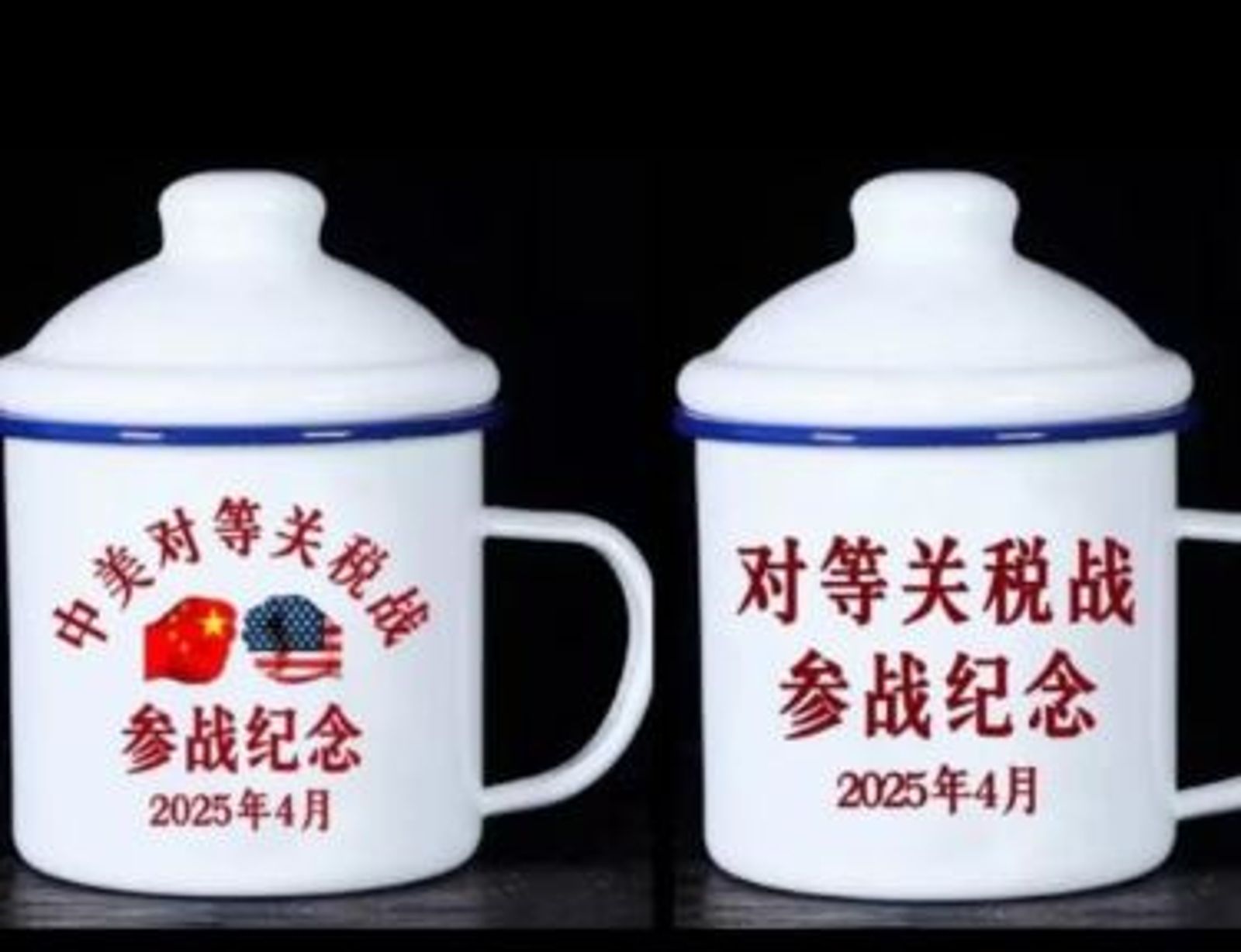 《星島日報》報導,近期中國電商如淘寶、拚多多等出現多款紀念杯上架,上面寫下「對等關稅戰參戰紀念 2025年4月」,比較高規格的還加上印上的中美國旗的拳頭互碰圖案,不少顧客都下單;價格上則介於10(新台幣45元)到26元人民幣(新台幣116元)。