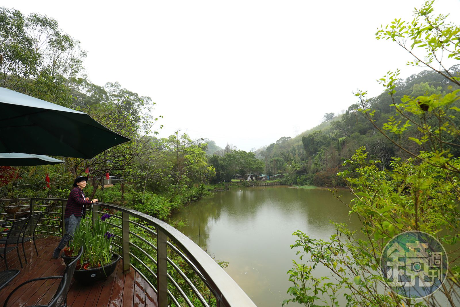 放眼望去,沽月日光的空間從牆面、吧台、桌椅,幾乎都是利用回收的廢棄木柴作為裝修材料。雖然這裡離峨眉湖畔有段距離,但走到戶外露台,大埤湖波光搖曳的模樣,讓這裡更多添一分雅緻。