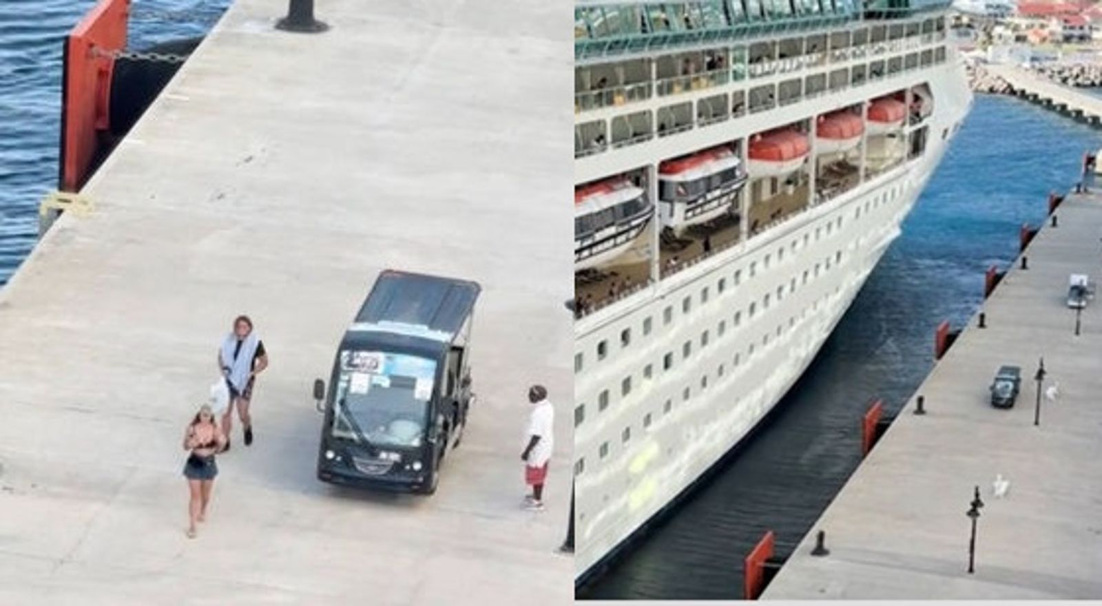 影片畫面顯示,就在郵輪緩緩離岸之際,一輛黑色高爾夫球車突然疾駛而至,車上載著一男一女,顯然正趕回船上。但當他們抵達碼頭時,郵輪已開始駛離,兩人站在原地目送郵輪遠去。此時船上乘客紛紛響起歡呼聲、吹口哨,有人甚至朝他們高喊「再見」。
