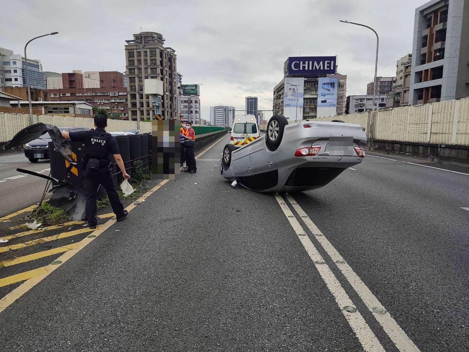 警方獲報後隨即到場處理,協助疏導車流,警方調查,陳男今早8點多開車沿市民高架往東上班,途中卻不慎自撞匝道口的防撞桶,導致車頭翹起翻車,高架橋僅有3車道,但翻覆車輛橫跨2車道,導致一早通勤車流回堵,經警方疏導指揮,事故現場在事發後約1小時後排除。 陳男酒測值為0,他脫困後告訴警方,當時因一時恍神才不慎自撞,所幸陳男僅有手臂輕微擦傷,未就醫,詳細肇事原因及責任歸屬尚待後續調查釐清。警方呼籲,駕駛人行駛高架道路應提高專注,注意道路設施及車前狀況,以確保行車安全。