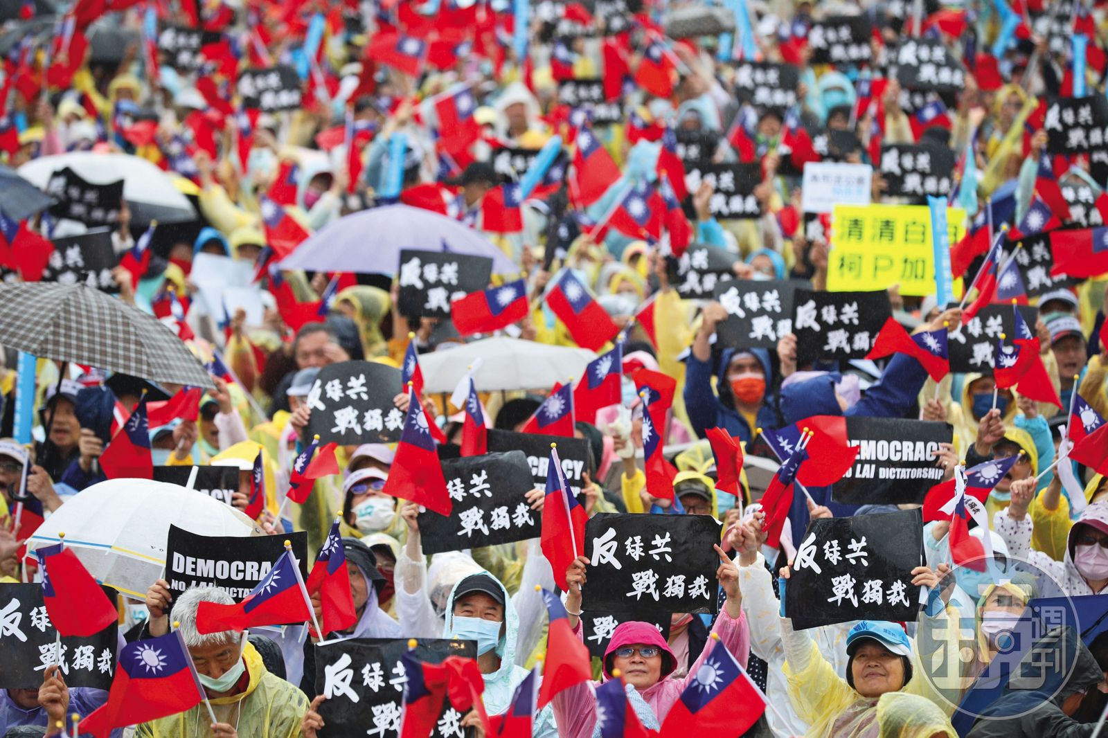 接下來的週末,換另外一群人上凱道。426那天,天公不做美,不過,仍然有超過5萬人站在雨中,撐著傘力挺國民黨發起的「反綠共戰獨裁」活動。主辦單位可能沒預料到會有這麼多人來,在景福門附近並未架設大銀幕。這些人看不到舞台上的講者,甚至聽不到舞台的聲音。不過,他們並沒有恍神發呆,每走幾步便會有人自發性地帶領群眾喊口號,「賴清德下台」的聲音此起彼落。就算他們是用遊覽車載來的,但有別於以往的人頭,他們那天的情緒非常高昂。他們是真心相信民進黨現在的所作所為是獨裁。