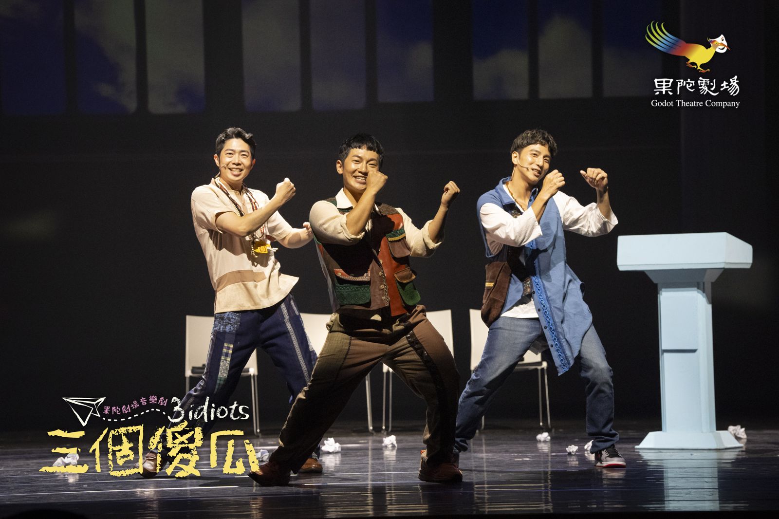 《三個傻瓜》保留原作樂觀精神,貫穿劇中的台詞「Be Water, My Friend」結合老子哲學,展現如水般自由與包容的生命觀。由梁志民執導,劇情結合東方哲學與亞洲音樂元素,透過喜劇形式探討人生與教育。巡演期間觀眾將獲得紙飛機摺紙參與互動,更多資訊請見果陀官網或Opentix。