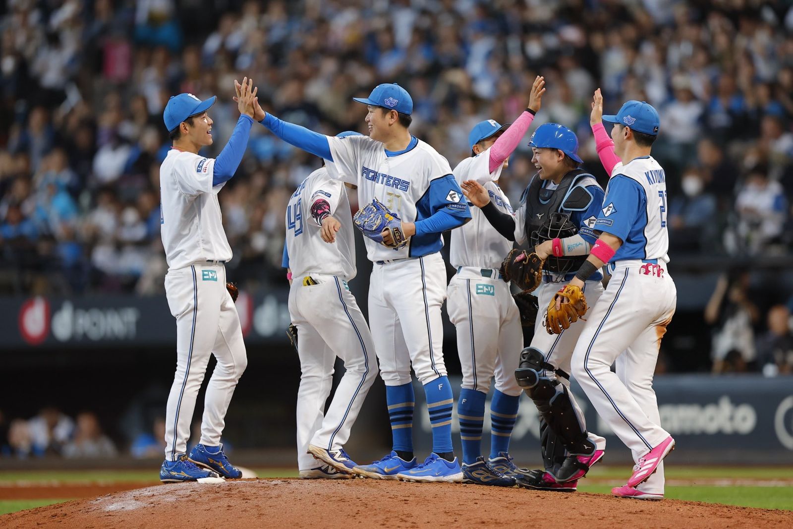 古林睿煬(中)繳出完投完封勝,難掩喜悅神情。(翻攝X@FightersPR)發布時間:2025.05.11 20:30 臺北時間
