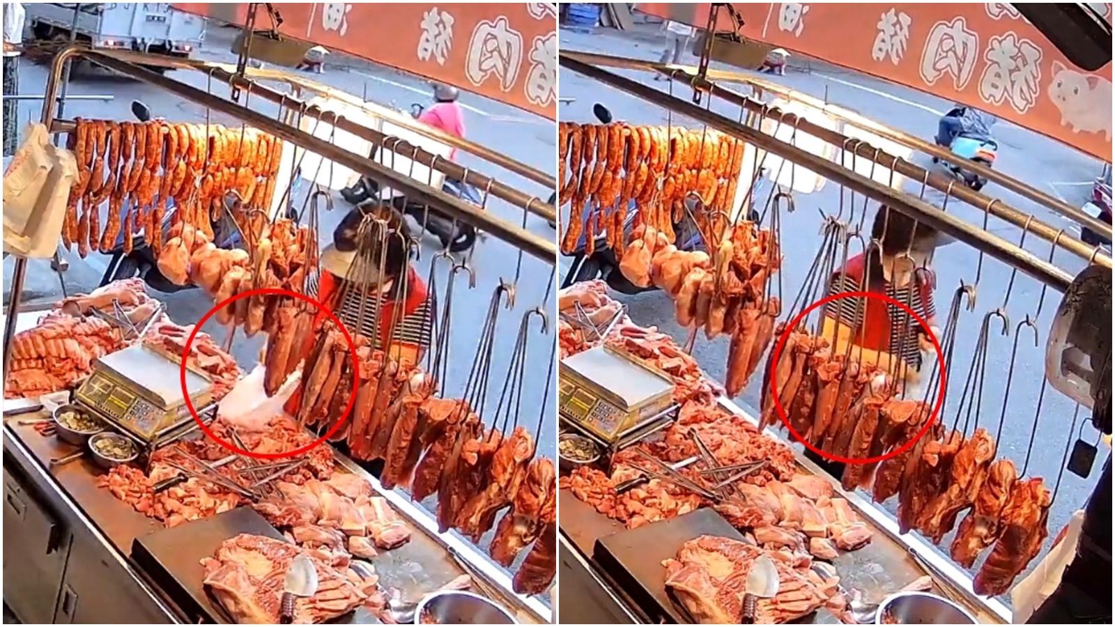 該名網友公開2個視角的監視器畫面,只見一個視角幾乎無法察覺紅背心婦女的偷竊手法,但仍可發現相關異常情形引起老闆娘的注意,只見老闆娘上前查看;另一個側邊角度就可清楚直擊婦女的偷竊過程,她在付完錢後,刻意將塑機袋放在肉上,趁著拿起時將一塊肉一併拿起,在轉身的瞬間放入袋中。