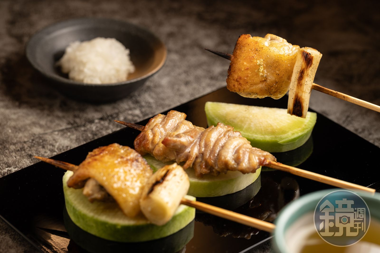以魚料理常使用的西京燒手法製作「雞胸西京燒」(左前)醃漬6小時入味後,再以炭火燒烤;「雞翅手羽先」(右後)除了強化煙燻香氣外,再刷上山椒油提昇香氣。(3,800元套餐菜色)新鮮的「雞心」(左起)燒烤後僅輕點胡麻油、3至5分半熟的「雞里肌」、肉感與風味鮮明的「醬燒雞大腿」,一次品嘗竹地雞美味三部曲。(3,800元套餐菜色)咬感獨特的「雞肩膀」(左起)、帶有筋膜與軟骨的緊實「雞頸肉」、雞腿根部緊鄰背部的「雞生蠔」,很考驗主廚的刀工與火候。(3,800元套餐菜色)至於像雞小腿、軟骨等不適合直火炭烤的部位,主廚則將其巧妙製成絞肉與雞鬆,變身創意料理「雞肉春捲」「雞肉丸」以及壓軸的「牛蒡雞鬆釜飯」。釜飯以日本高級料亭指定的雲井窯土鍋炊煮,米則嚴選日本山形縣產的艷姬米,以柴魚高湯與牛蒡湯汁慢火熬煮,最後拌入油揚、海苔、炸牛蒡絲、牛蒡片與雞鬆,好吃到讓我連添三碗停不下來。