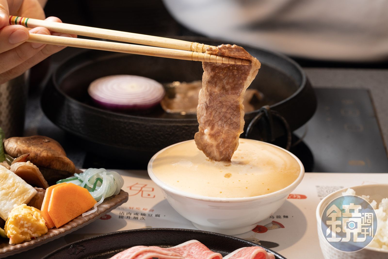 至於壽喜燒的靈魂沾醬「生雞蛋」,玉兔則玩出新花樣,「有些人會害怕生雞蛋的蛋腥味,但壽喜燒的精髓真的是蛋液,於是我們想到了法式的Foam。」王斯楷解釋,有別於一般壽喜燒提供新鮮雞蛋讓客人自行沾取,玉兔選用產自苗栗的頂級靈芝蛋,以氮氣瓶將蛋液打發成綿密輕盈的雞蛋慕斯,讓每一塊肉片都被蛋香柔滑包裹。