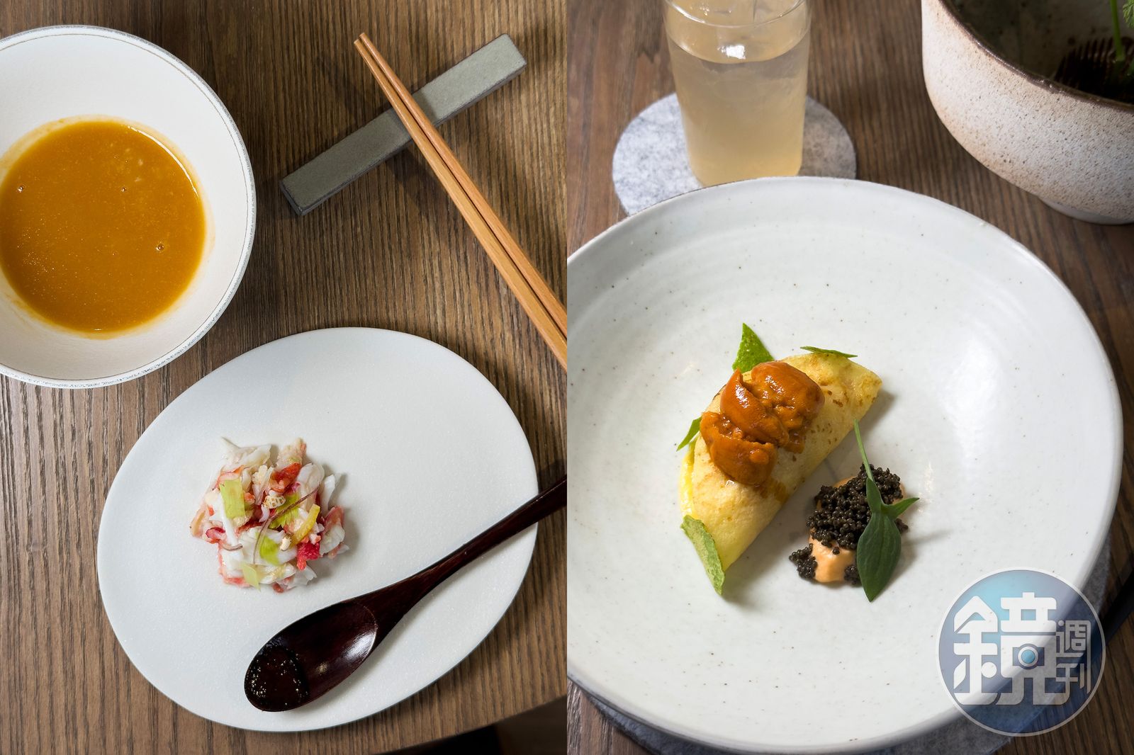 套餐開場「卵/œuf/蛋」,概念直指台灣早餐的靈魂角色「玉米蛋餅」。William運用法式可麗餅模擬南部粉漿蛋餅的軟嫩與脆皮蛋餅的邊緣焦香。餅皮包裹以海膽拌炒的玉米滑蛋,濃郁的海膽鮮甜與蛋香交融,上方點綴以稻草煙燻過的鵪鶉水波蛋,簡直是神來之筆,為整體清爽風味增添意想不到的記憶點。一旁搭配的醬汁,是以日本「田園魚子醬」地膚子翻玩番茄醬的概念,酸甜滋味正好平衡海膽的濃郁,也呼應主廚個人吃蛋餅必沾番茄醬的習慣。