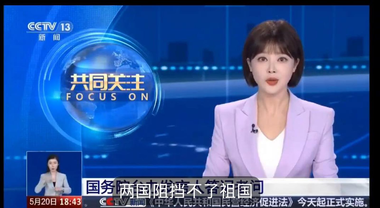 矢板明夫昨(21日)晚間在臉書提到,賴清德總統在520就職一週年演說中,罕見未提及兩岸關係。但是,中國國台辦發言人陳斌華依然強硬回應,「不管台灣地區領導人講什麼,都阻擋不了『祖國』終將統一」,沒想到中國官媒央視主播胡蝶,在播報這條新聞時誤將「祖國」講成「兩國」。