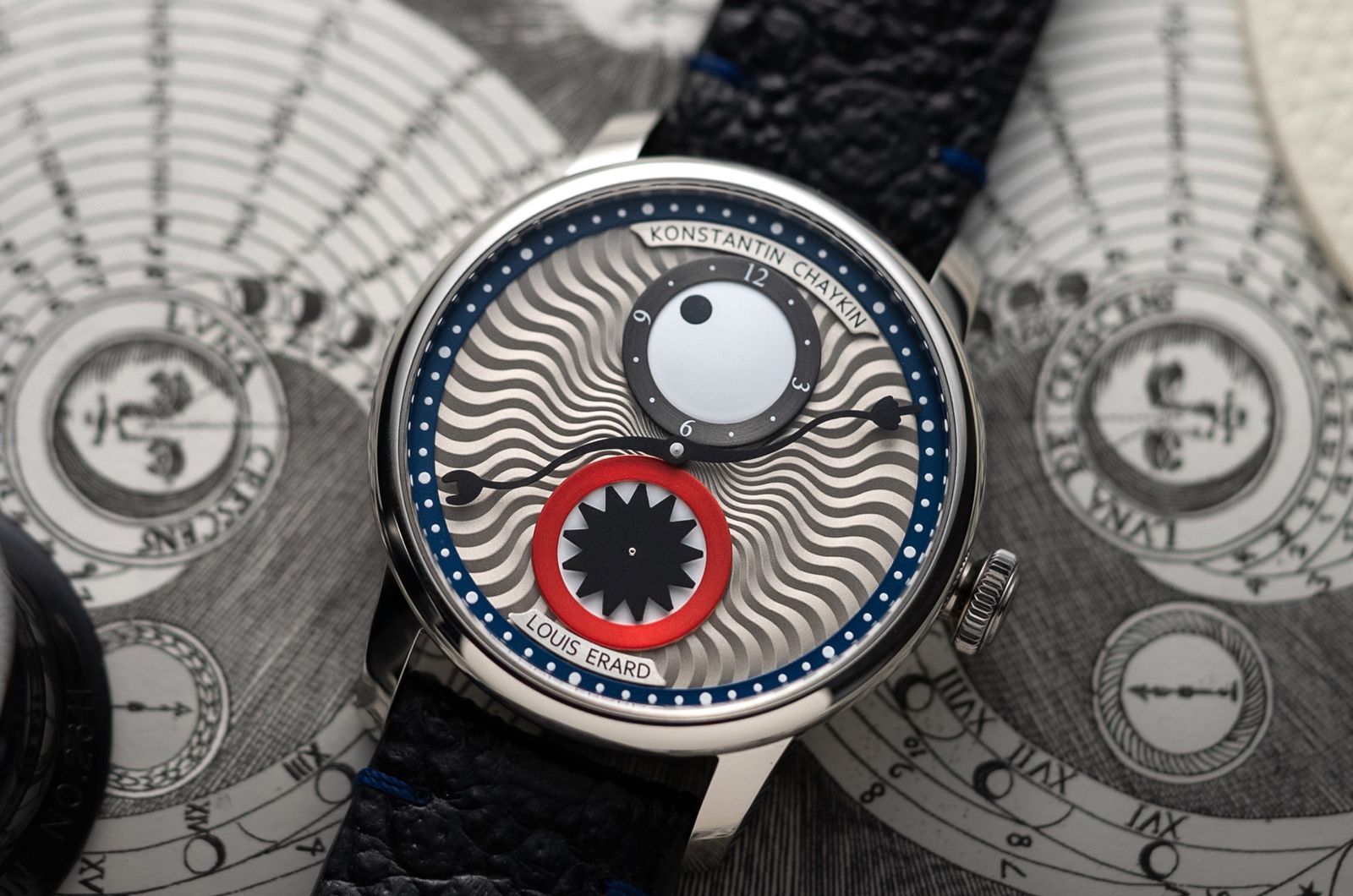 這次推出兩個版本:Louis Erard 發行藍色款(直徑 42mm)、Konstantin Chaykin則另行獨立販售紅色款(直徑 39mm),各限量 178 枚。除了尺寸與配色略有差異,分鐘刻度圈也分別採藍與紅設計,6點與12點方位標註雙品牌標誌,細節上保留彼此語言,設計上則維持統一節奏。