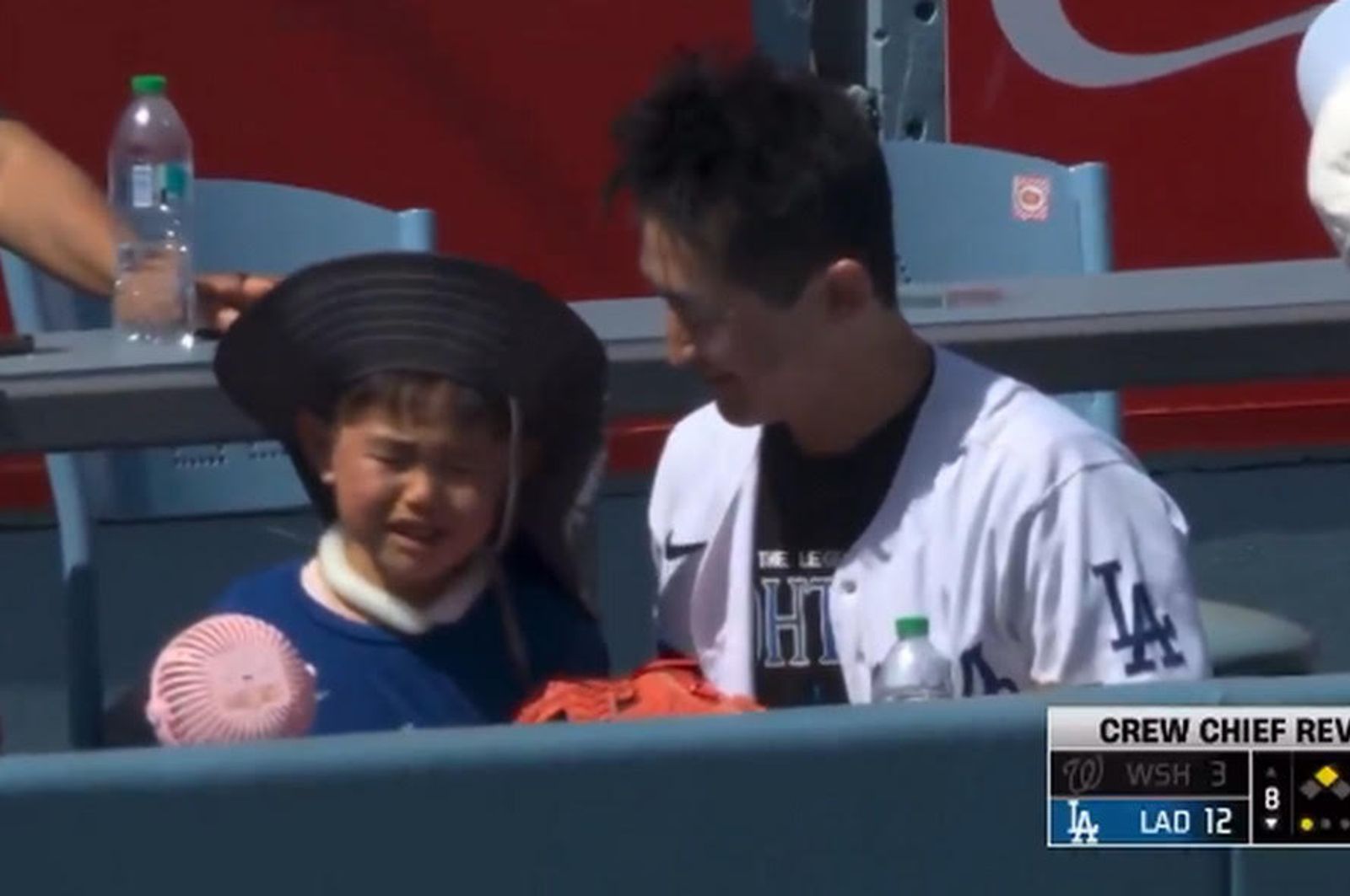 大谷翔平在8局下半奮力一擊,敲了一顆超遠的飛球,球一度被一位眼明手快的男性球迷接住後彈回場內,裁判初步判決為二壘安打,大谷翔平也輕鬆地停留在二壘,與對手球員談笑風生。隨後經重播輔助判決,被改判為全壘打,替道奇隊再添兩分。然而,轉播畫面捕捉到該位接球失誤的球迷身旁,一位小朋友當場嚎啕大哭,而這位爸爸則焦急地安撫著孩子,意外成為場邊的溫馨插曲。