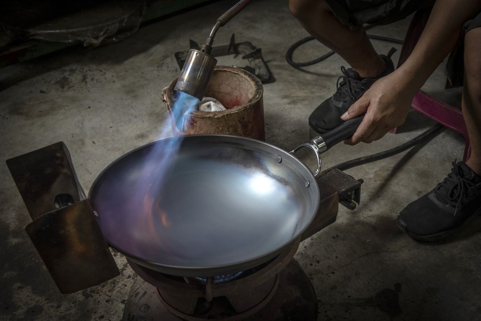 和美鐵鍋之所以備受青睞,關鍵在於用料與工法的實在講究。全系列採用SGS檢驗的中鋼鐵板製作,無任何塗層處理,導熱迅速、堅固耐用,長年來是無數小吃攤與熱炒廚房的得力助手,也是職人手中可靠的生財利器。然而,鐵器有性,「生鏽」這項與生俱來的特質,讓鐵鍋的保養成為使用者最難跨越的門檻。首次使用前須以高溫燒鍋揮發防鏽油,俗稱「開鍋」,接著再於鍋面塗抹食用油,養成天然「不沾層」,即為「養鍋」。