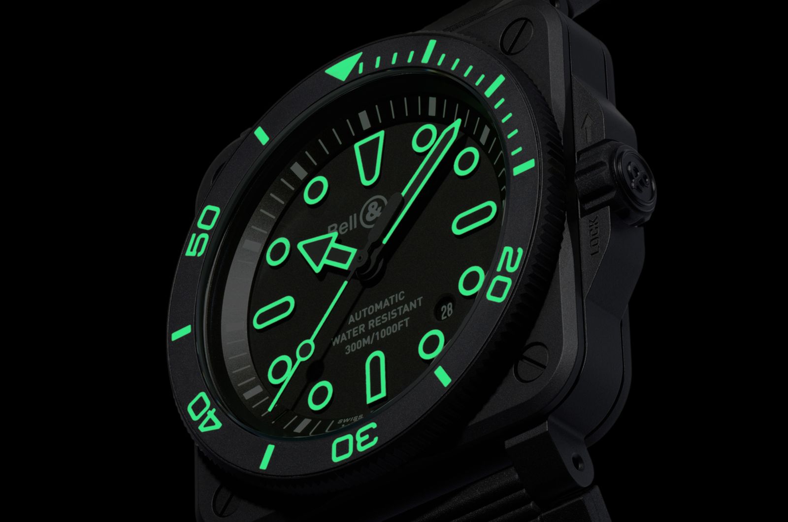 ●Bell & Ross Lum 系列(2017 年~):以 Super‑LumiNova X2 為核心,將夜光從指標延伸至整個錶盤與錶殼。代表作如 BR 03‑92 Horolum、Full Lum,至 2023 年的 BR‑X5 Green Lum,更以夜光複合材質打造整體結構,在暗處呈現全面發光效果。