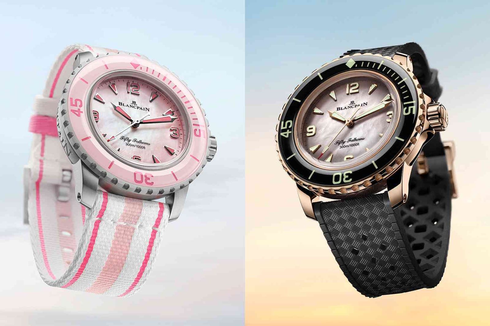 寶珀的「五十噚」潛水錶誕生於 1953 年,由當時的執行長 Jean-Jacques Fiechter 與法國軍方共同合作研發,是全球第一枚現代潛水腕錶,開創了單向旋轉錶圈、自動上鍊機芯與高對比夜光錶盤等潛水錶標準。而這一項成就,讓「五十噚」於 2007 年以重新量產上市之後,一直維持其經典的軍錶外型,並長期與海洋保育組織合作進行「心繫海洋計畫」。後來寶珀為「五十噚」開發另一個「深潛器」(Bathyscaphe)子系列,即用來做出更復古、更多風格化的呈現。