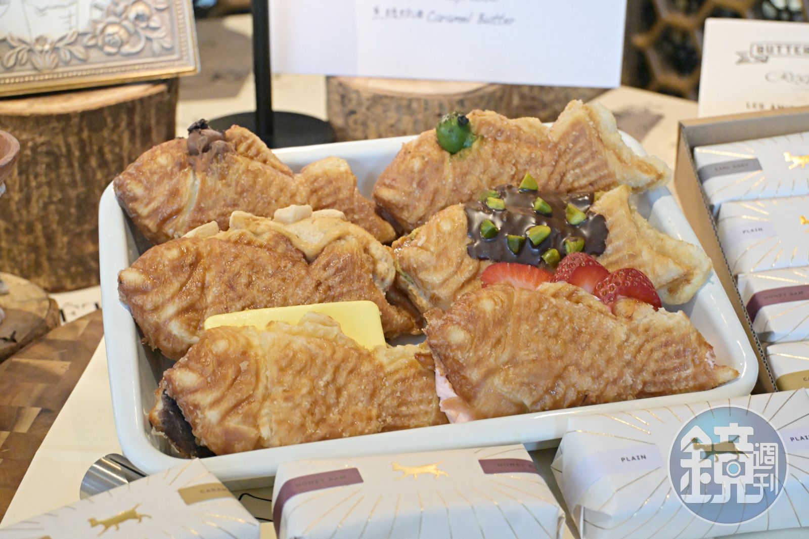 Les Amis Honnetes的品牌創辦人兼主廚朴成彩畢業於法國藍帶廚藝學院,他跳脫傳統日式鯛魚燒的印象,以可頌麵皮取代原本的奶蛋麵皮,將可頌麵糰塗上糖漿後放入鯛魚燒模具中烘烤,各種口味的內餡則是以法式卡士達為基底做變化,融入絲滑爆漿口感,風味與顏值兼具的新派甜點,吸引排隊人潮上門搶購,成為江南甜點圈的爆紅商品。