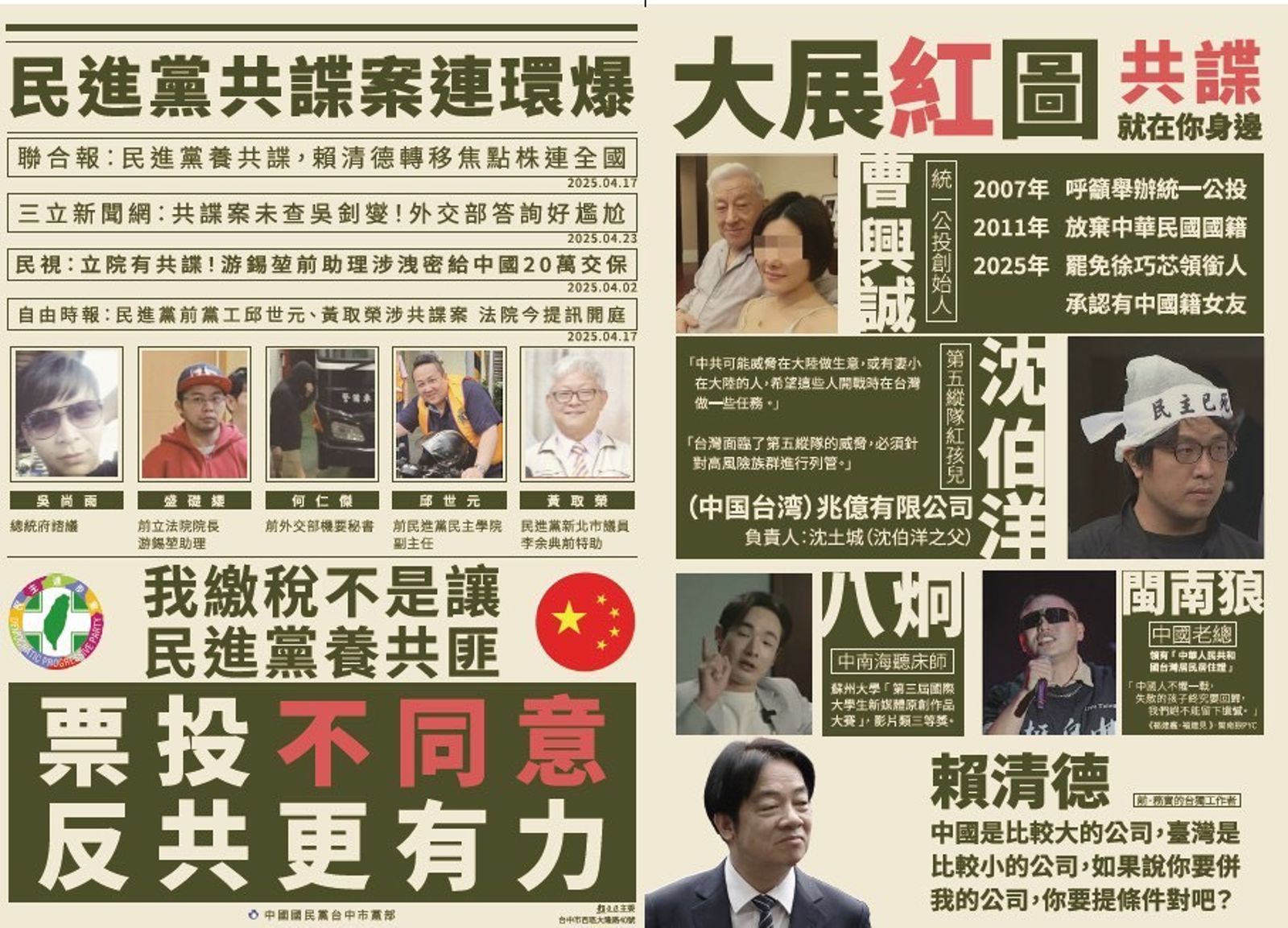 藍營抗罷文宣列舉民進黨涉共諜案黨工,強調「我繳稅不是讓民進黨養共匪」,更以斗大字樣強調「票投不同意,反共更有力」。不僅如此,該文宣也直指反共護台志工聯盟發起人、聯電創辦人曹興誠曾喊話辦統一公投、交中國女友,民進黨立委沈伯洋父親做中國生意,網紅八炯、閩南狼過去對中言論,以及總統賴清德拋「併購說」,諷刺綠營不只共諜案連環爆,還大展「紅」圖,最後署名由國民黨台中市黨部印製。
