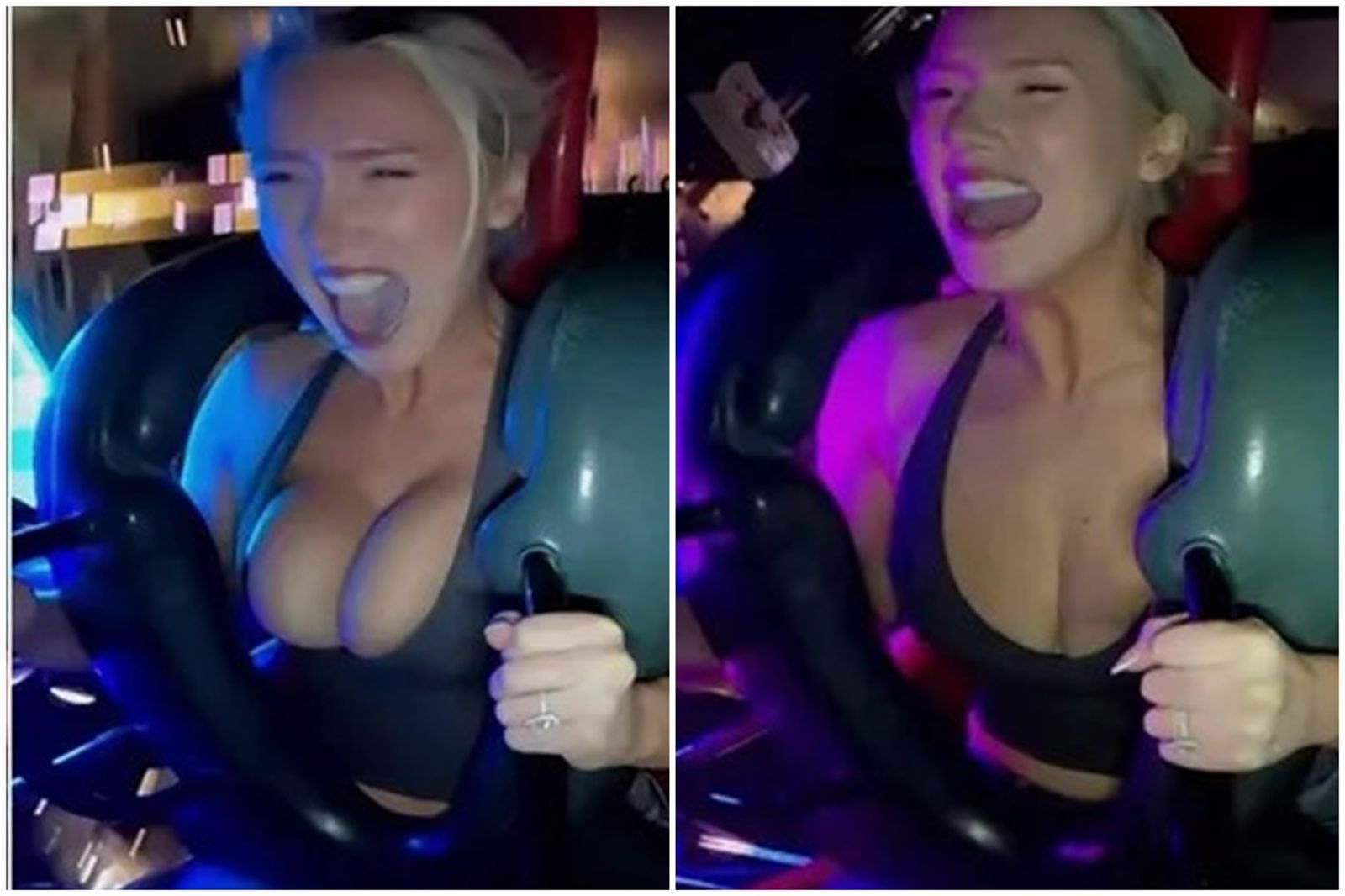 一名金髮波動妹去遊樂園玩類似「彈射」遊樂設施,吸引2700萬網搶看。(翻攝自IG)雖艾蜜莉去年9月才開始經營社群,目前粉絲也不到1萬人,但每每分享豪乳的「水波盪漾」火辣影片,時常引發話題與關注。