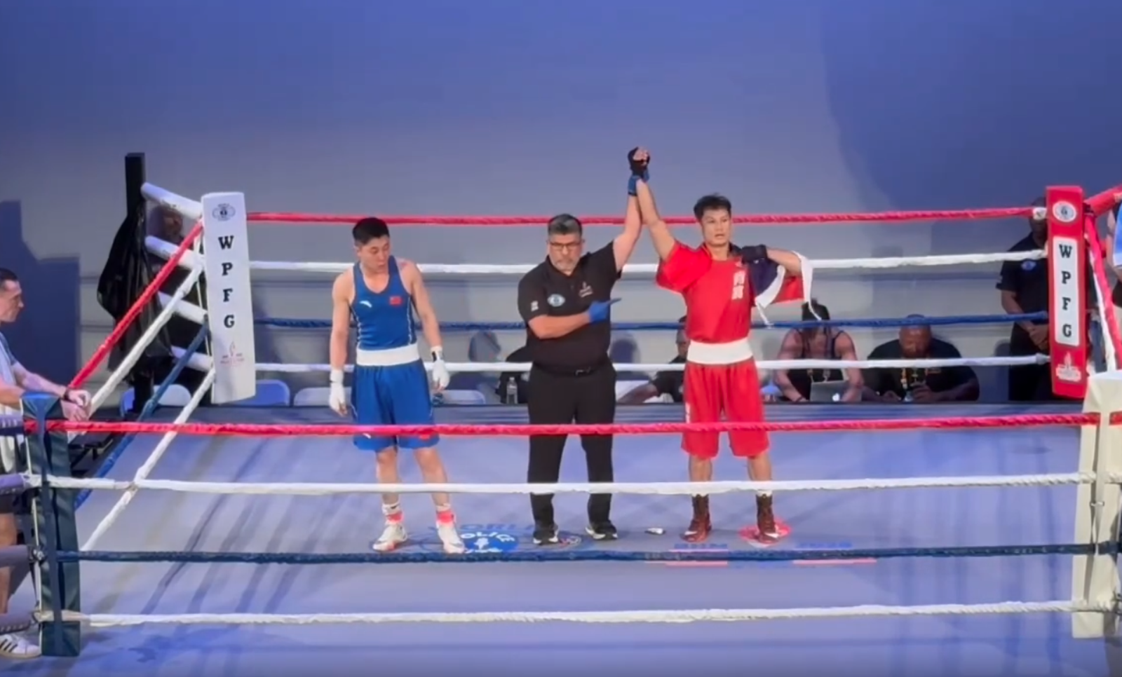 這場拳擊比賽18歲以上組級分賽中,陳鵬畯登場前保持冷靜專注,而對手中國選手卻在開打前就披上五星旗繞場歡呼,場邊支持者也大聲助陣,宛如提前慶祝勝利。比賽一開始,陳鵬畯就展現出絕佳的節奏控制與爆發力,穩紮穩打,最後一舉將對手KO,大會也高聲宣布:「勝者來自台灣,陳鵬畯!」