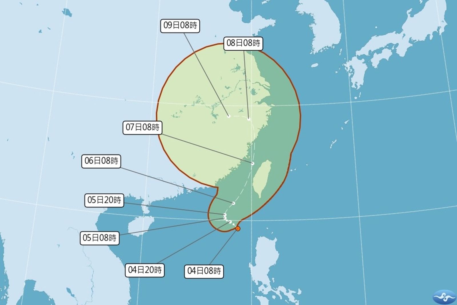 到了週六(5日)白天起,系統將受到東側高壓帶向西推擠的影響,開始往北北東或東北方向移動,逐步靠近台灣海峽南部海域。雖然週六白天移動速度仍不快,但晚間之後將逐漸加速。預計週日(6日)時,颱風將快速通過台灣海峽,並繼續北上。颱風中心有可能在週日晚間至週一(7日)上午期間最接近台灣西半部沿岸,甚至不排除直接在台中以南沿岸登陸的可能性。隨後在週一下午,颱風將逐步遠離台灣附近區域。