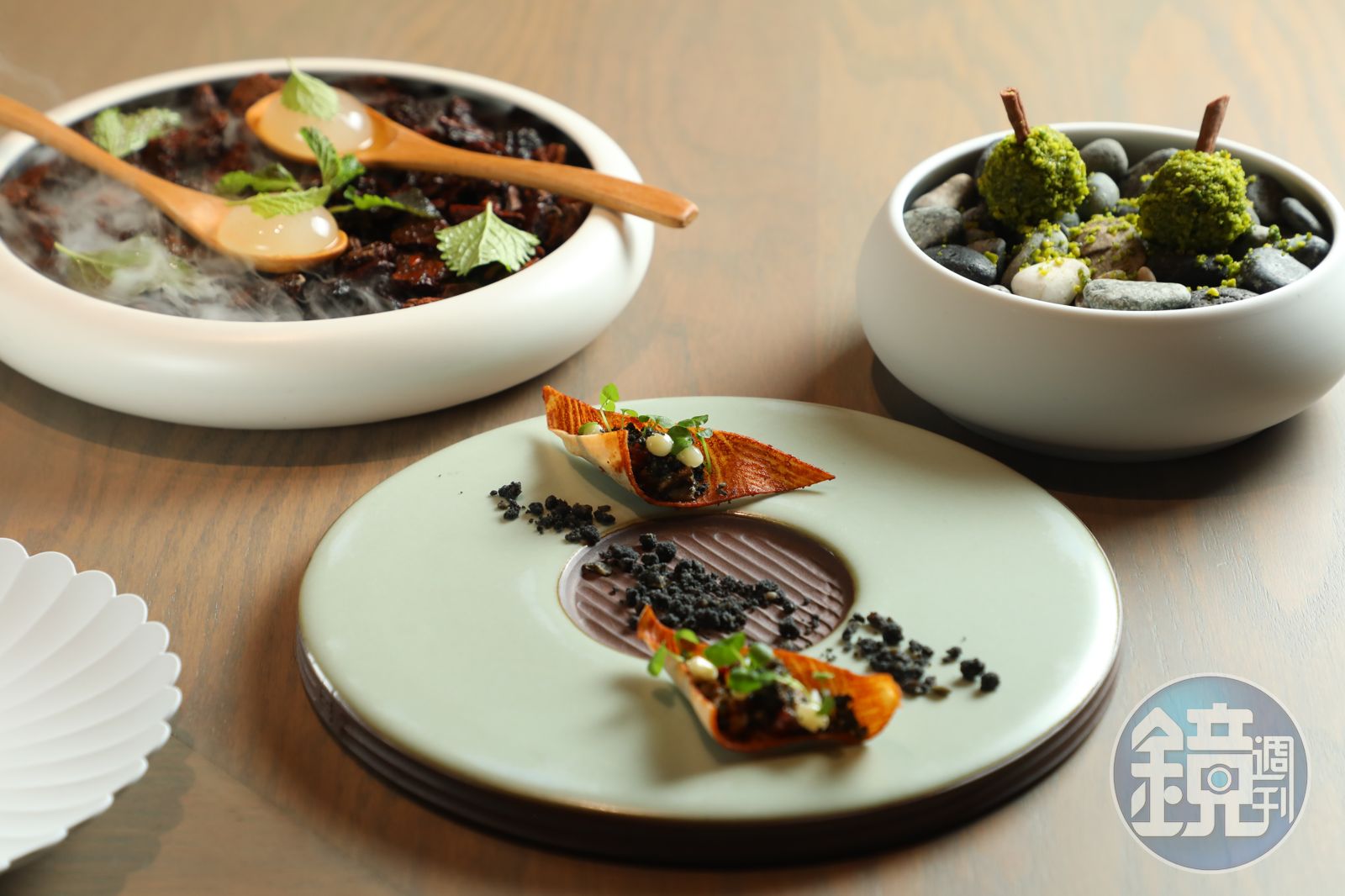 最後主廚以北海道奶油乳酪和自製瑞可塔起司製成棒棒糖般的圓球,外面包覆翠綠色的開心果粉,內藏鳳梨果乾和馬告,象徵傍晚時分森林岩石上的苔蘚,入口乳香與果香兼具,讓人低吟回味,接連在口腔中綻放的3種創意,的確鋪排了一個亮麗的開場。