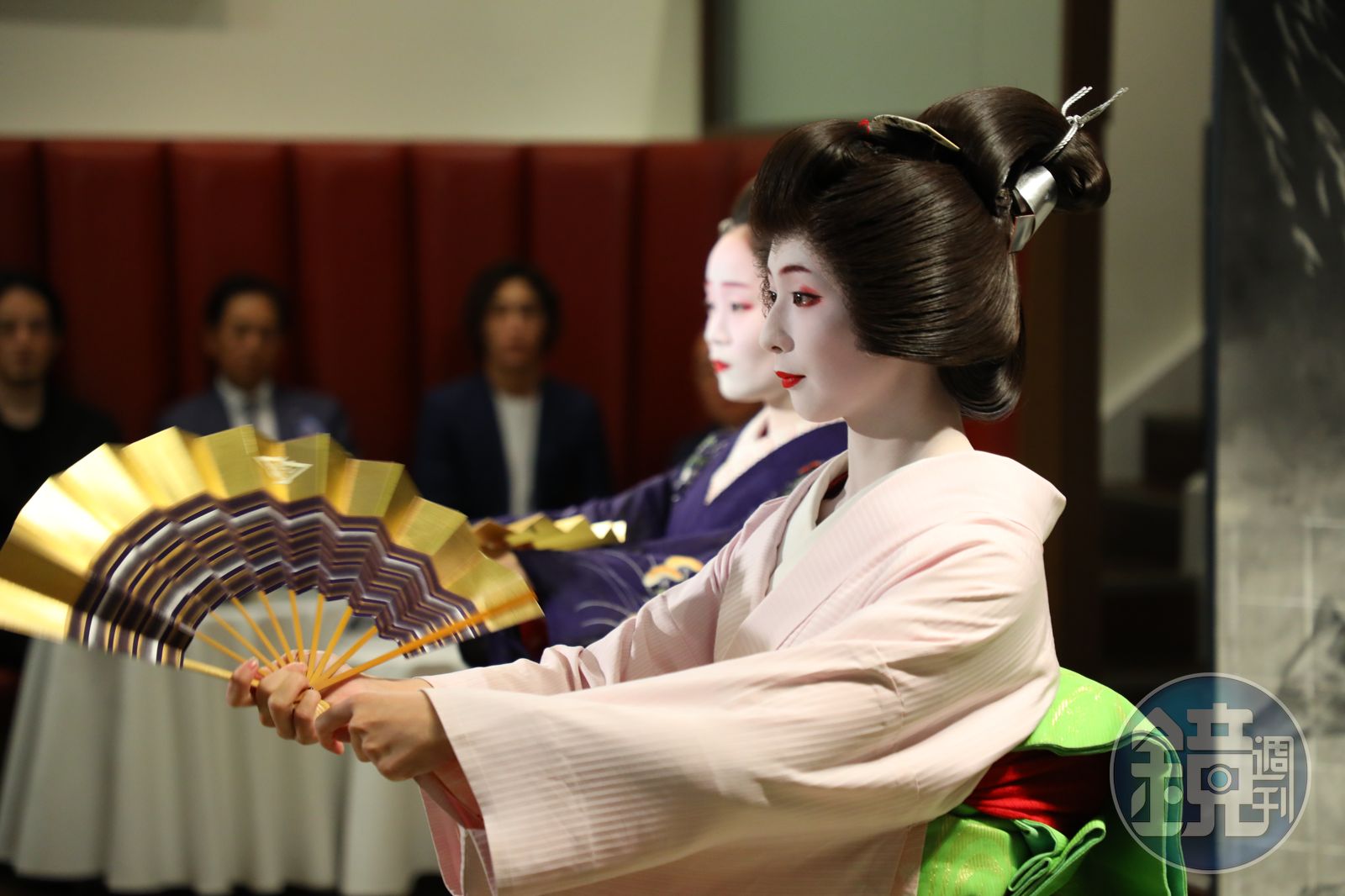 一般觀光客即使去到京都也很難見到藝伎真容,更別說觀賞演出了,林浩司特地動用關係,邀請到京都衹園甲部的藝伎美羽子、多都葉、舞伎穗乃佳和三味線演奏家福奈美,在他收藏的日本新生代藝術家川又聰作品〈狼_風息〉的屏風作品前,演出三首曲目〈東山名所〉〈夏夜螢光〉〈衹園小唄〉。