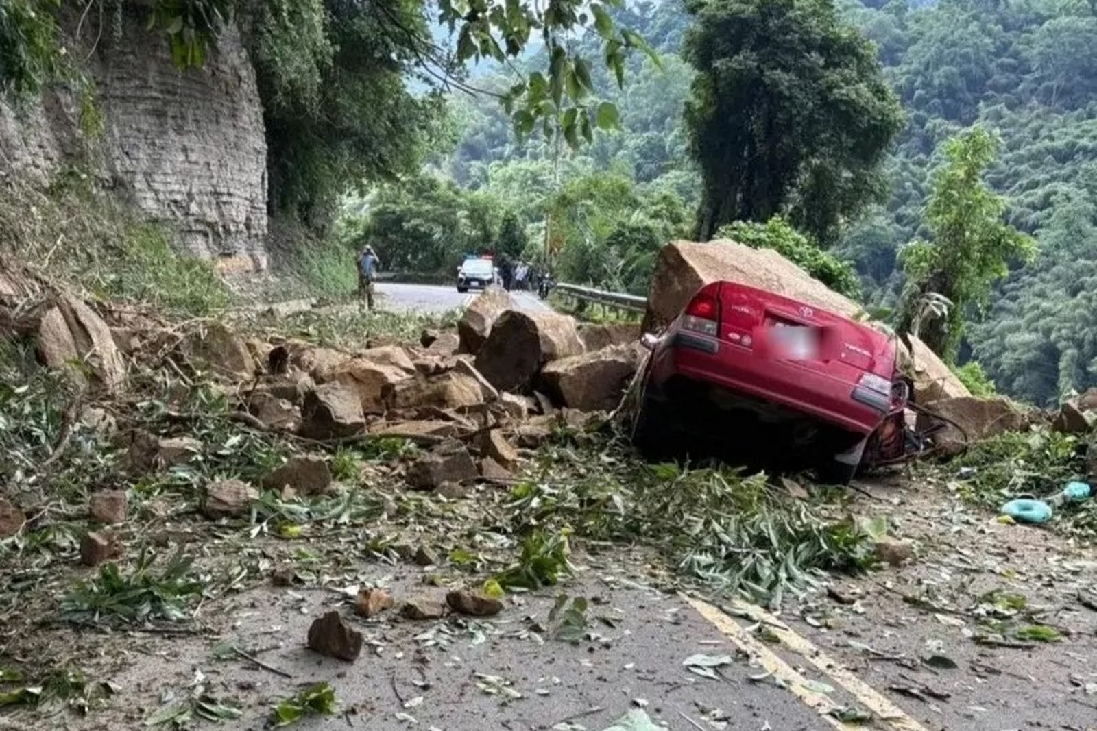 事故發生於下午3時30分左右,地點位於苗62-1線清安道路,朝清安國小方向。當時這輛紅色自小客車正巧通過該路段,卻被一塊比車體還大的巨石「泰山壓頂」,車頂遭受猛烈撞擊,車身瞬間凹陷、毀損變形,現場散落大量碎石與樹枝。