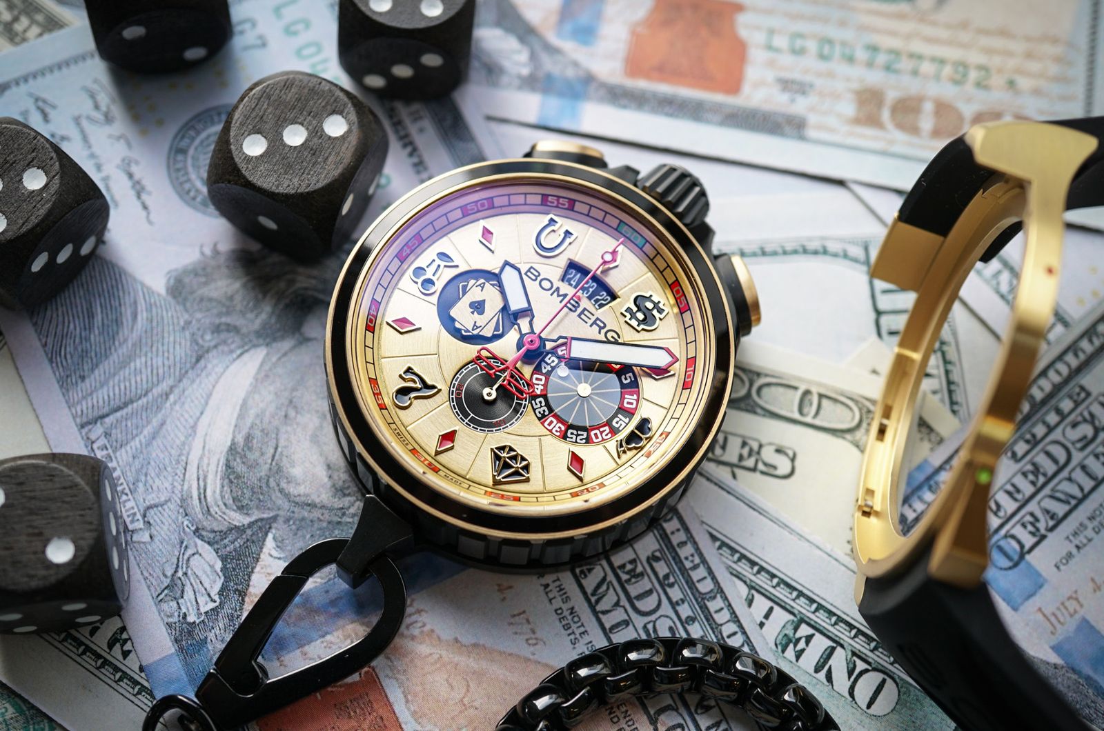 面盤的設計也很直白。ICE CRYSTAL冰晶賭場是銀白底配綠色計時秒針,乾淨、層次清楚;GOLDEN CHIP黃金籌碼則是金屬髮絲紋配紅色計時秒針黑色錶帶,紅、黑、金的細節讓人一眼想到籌碼和賭桌區塊。兩款都有馬蹄鐵、老虎機、撲克牌、幸運數字等符號,但排版沒有亂成一團,計時盤和日期窗還是很好讀。BOMBERG 的方向,是用圖像去傳達賭場氣氛,這樣的好處是外觀好理解、戴起來沒負擔。缺點就是少了如Franck Muller Vegas和 Christophe Claret 21 Blackjack具備互動機關的娛樂性,但價格也完全是不同宇宙等級。