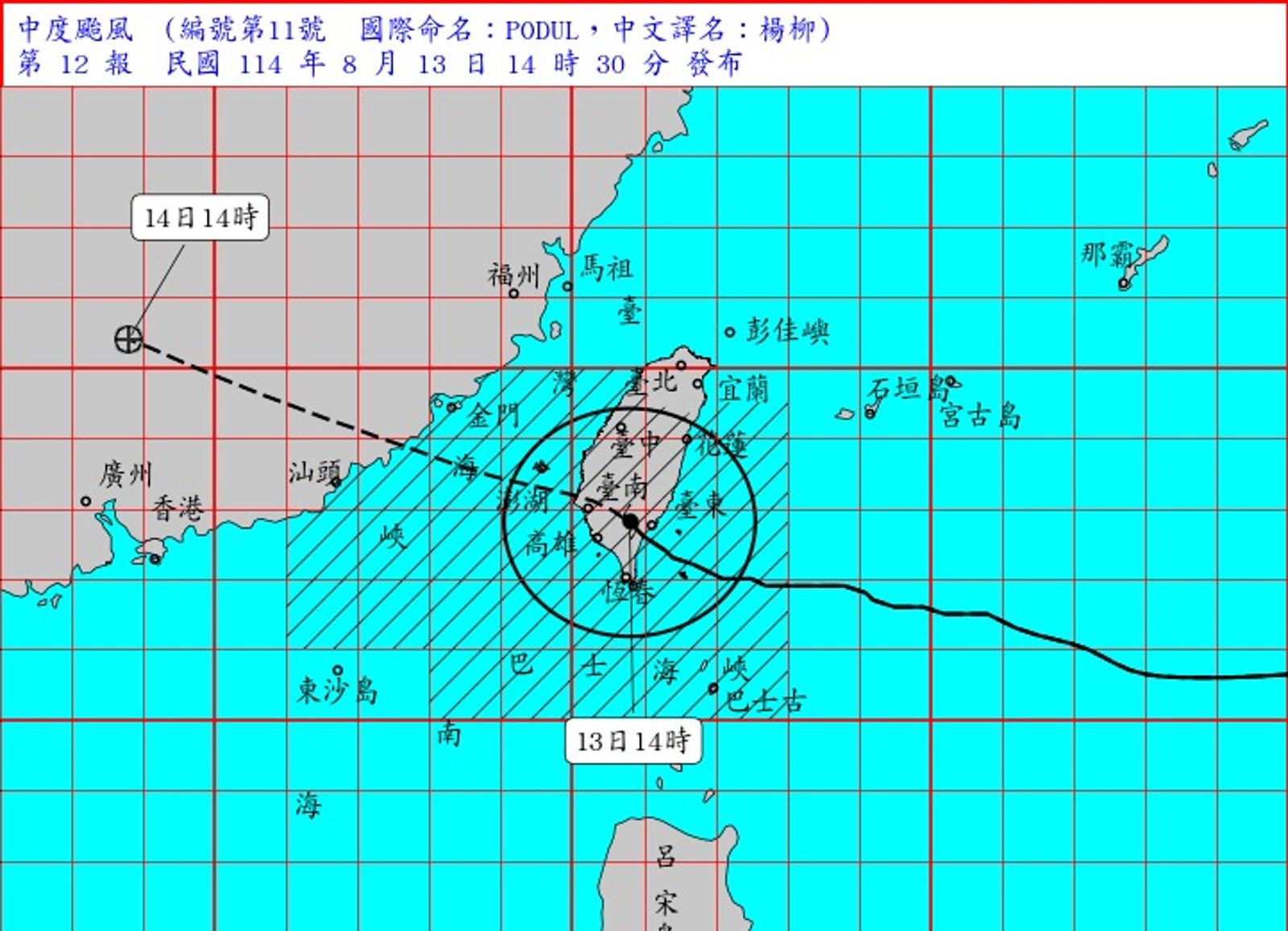 根據氣象署公布最新風力預測,明凌晨0時至上午6時,包含雲林縣濱海鄉鎮、嘉義縣濱海鄉鎮、台南市濱海鄉鎮、高雄市濱海鄉鎮、金門縣及澎湖縣將出現平均風7級或陣風10級以上,達到停班課標準。另外,依據最新24小時雨量預測,今下午2時至明天下午2時嘉義縣山區、高雄市山區及屏東縣山區雨量也達標。其中嘉義縣山區預估雨量將達150至250毫米,高雄市山區達200至450毫米,屏東縣山區達200至450毫米。