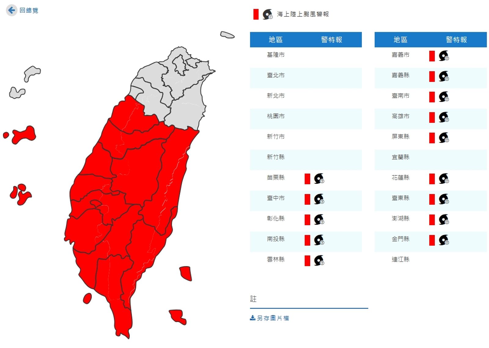 陸上警戒範圍包含花蓮、台東、苗栗、台中、彰化、南投、雲林、嘉義、台南、高雄、屏東、澎湖、金門應嚴加戒備。海上警戒則為台灣東半部海面、巴士海峽、台灣海峽及東沙島海面航行及作業船隻應嚴加戒備。