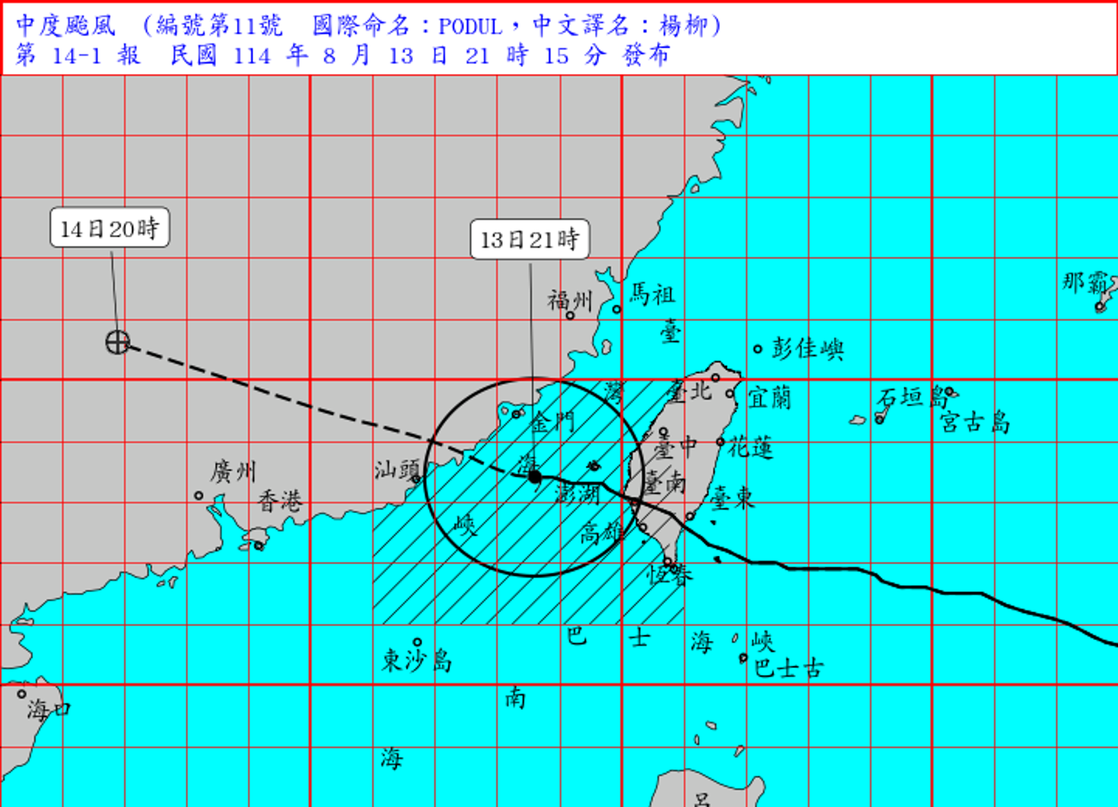 中央氣象署今(13日)21時15分更新海上陸上颱風警報,21時的中心位置在北緯23.4度、東經118.6度,即在澎湖的西南西方約100公里之處,以每小時31公里速度,向西北西進行,七級風平均暴風半徑180公里,十級風平均暴風半徑60公里。