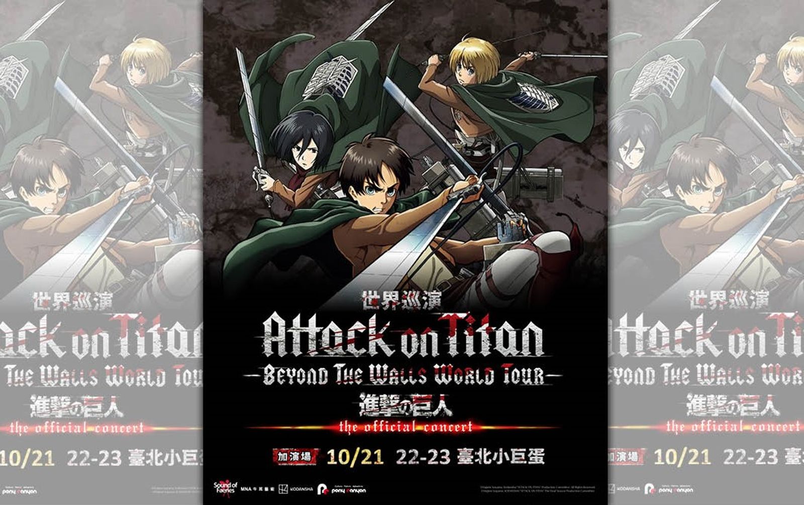 《進擊的巨人》- Beyond the Walls 世界巡演- 10月21日場次將於明天(14日)中午12點,MNA售票網加演場開賣,建議樂迷提早完成會員認證程序,每個會員帳號限購四張。購票請至MNA售票網。