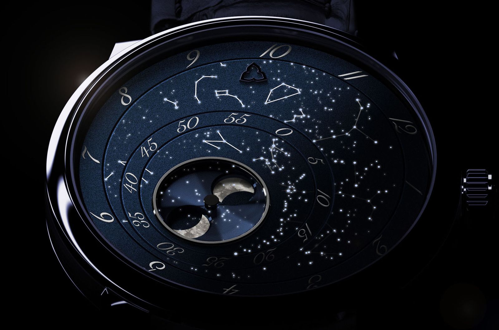 外圈和中圈分別以逆時針方向運行,三葉標記對應目前的時與分。內圈則是一片藍寶石秒盤,刻有細緻的星點圖案,與秒輪同步轉動。月相顯示被安置在這片星空裡,與秒輪共用同一軸心,形成一快一慢的運動層次。月相的驅動採 59 齒輪系統,對應朔望月約 29.53 天的週期,長時間使用仍能保持良好精度。因為星空盤每 60 秒轉一圈,月亮的變化顯得格外緩慢,讓人在日常讀時中,也能察覺時間的更替與節奏。
