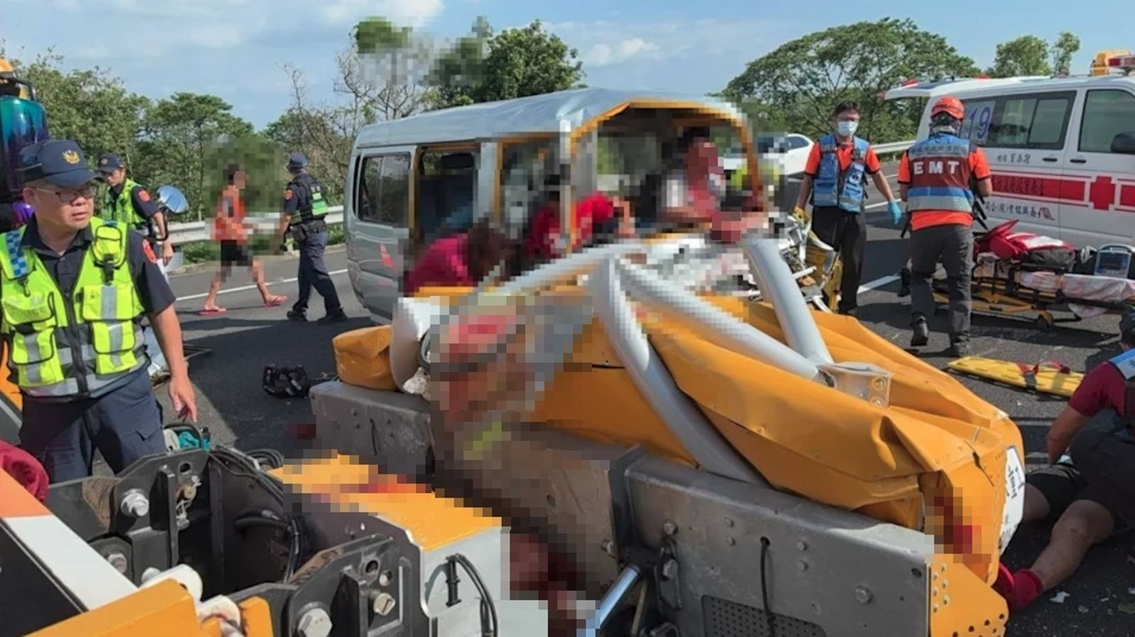 台南市消防局119勤務中心接獲報案後,緊急出動13輛車、24名人員趕赴現場救援。救難人員到場後,立即破壞變形的車體,將傷者逐一救出並送醫急救。已知8名傷者中,4人傷勢嚴重,其餘人員也都有不同程度擦挫傷。 事故發生後,學校校長第一時間趕赴醫院關心傷者,嘉義縣教育處處長與科長也到場了解情況,承諾將提供所有醫療與後續所需協助。至於詳細肇事原因,國道警方仍在進一步調查釐清中。
