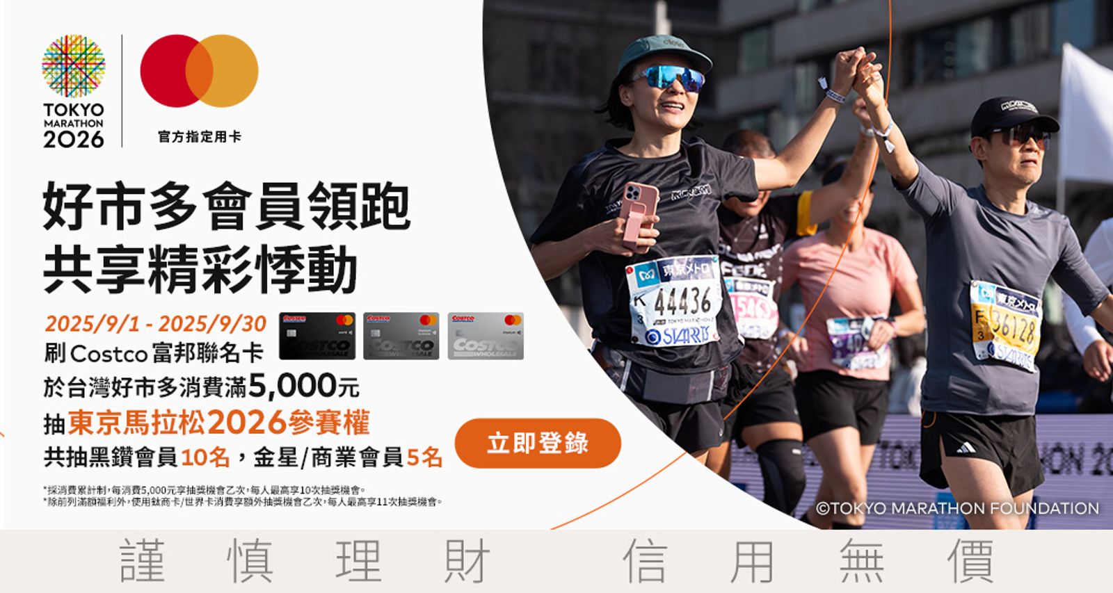 萬事達卡台灣區董事總經理陳懿文指出:「台灣民眾運動風氣盛行且熱愛參加馬拉松賽事,今年參加東京馬拉松的台灣跑者人數高達1,500人,已連續3年位居海外參賽跑者人數第二名。萬事達卡身為東京馬拉松2026官方支付合作夥伴,特別攜手Costco好市多與台北富邦銀行推出一系列精彩的東京馬拉松2026相關活動,要讓卡友有更多機會親臨亞洲唯一的世界七大馬賽事,開啟更多熱血與無價的時刻。」更多活動詳情與抽獎辦法,請見:https://www.costco.com.tw/eventTokyoMarathon2026。