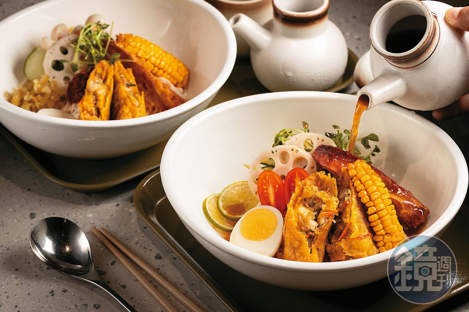 楊宇桁近來新推夏日限定的「酸菜辣拌冷麵」與「冰釀番茄冷麵」,麵條用的是紀文豆腐麵,加上大量當季蔬菜,號稱低脂、低卡、減醣;但別以為味道很寡淡,楊宇桁花了很多心思研究冷湯,又解構酸菜魚元素,在冷麵裡放上混合魚肉、蘿蔔、冬粉,再用青花椒調味的春捲,吃起來既有魚肉的嫩、花椒的麻,還有豐富口感,整碗冷麵吃下來,清爽不膩又有飽足感。